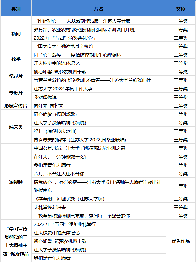 7月11日至12日,2022-2023高校影视作品交流展映活动在无锡举行,活动由中国教育电视协会高校电视专业委员会主办,江南大学承办。我校共获得28个奖项,其中一等奖4项、二等奖11项、三等奖8项、“学习宣传贯彻党的二十大精神”主题优秀作品5项。