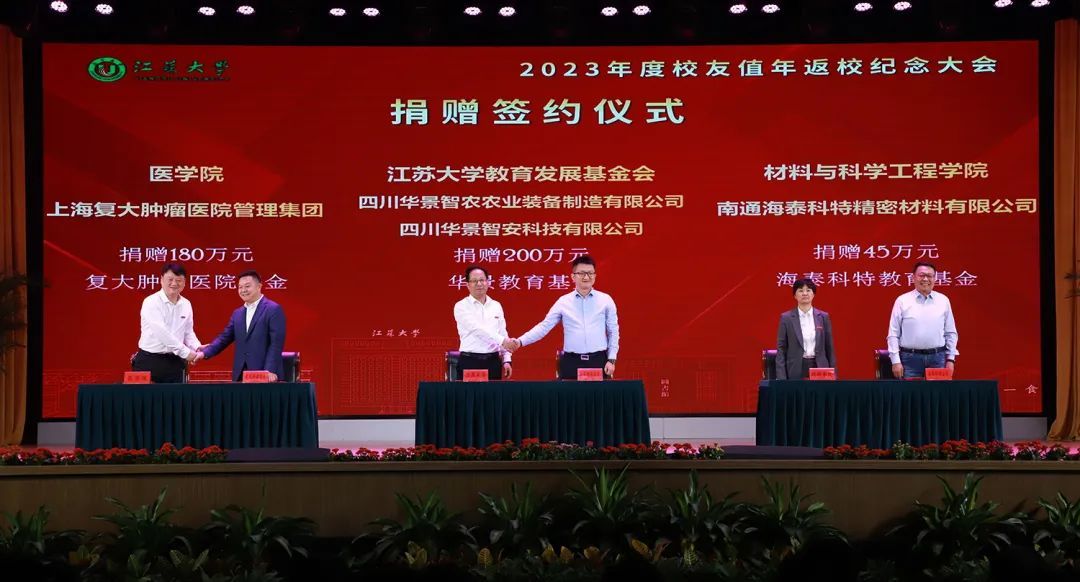 会上举行了校友和爱心企业向学校捐赠签约仪式。校友陈俊年创立的四川华景智农农业装备有限公司、四川华景智安科技有限公司两家企业共捐赠200万元在乐鱼app官网登录入口设立“华景教育基金”,上海复大肿瘤医院管理集团向乐鱼app官网登录入口医学院捐赠180万元设立医学发展基金——“复大肿瘤医院基金”,南通海泰科特精密材料有限公司向乐鱼app官网登录入口材料科学与工程学院捐赠45万元设立“海泰科特教育基金”。