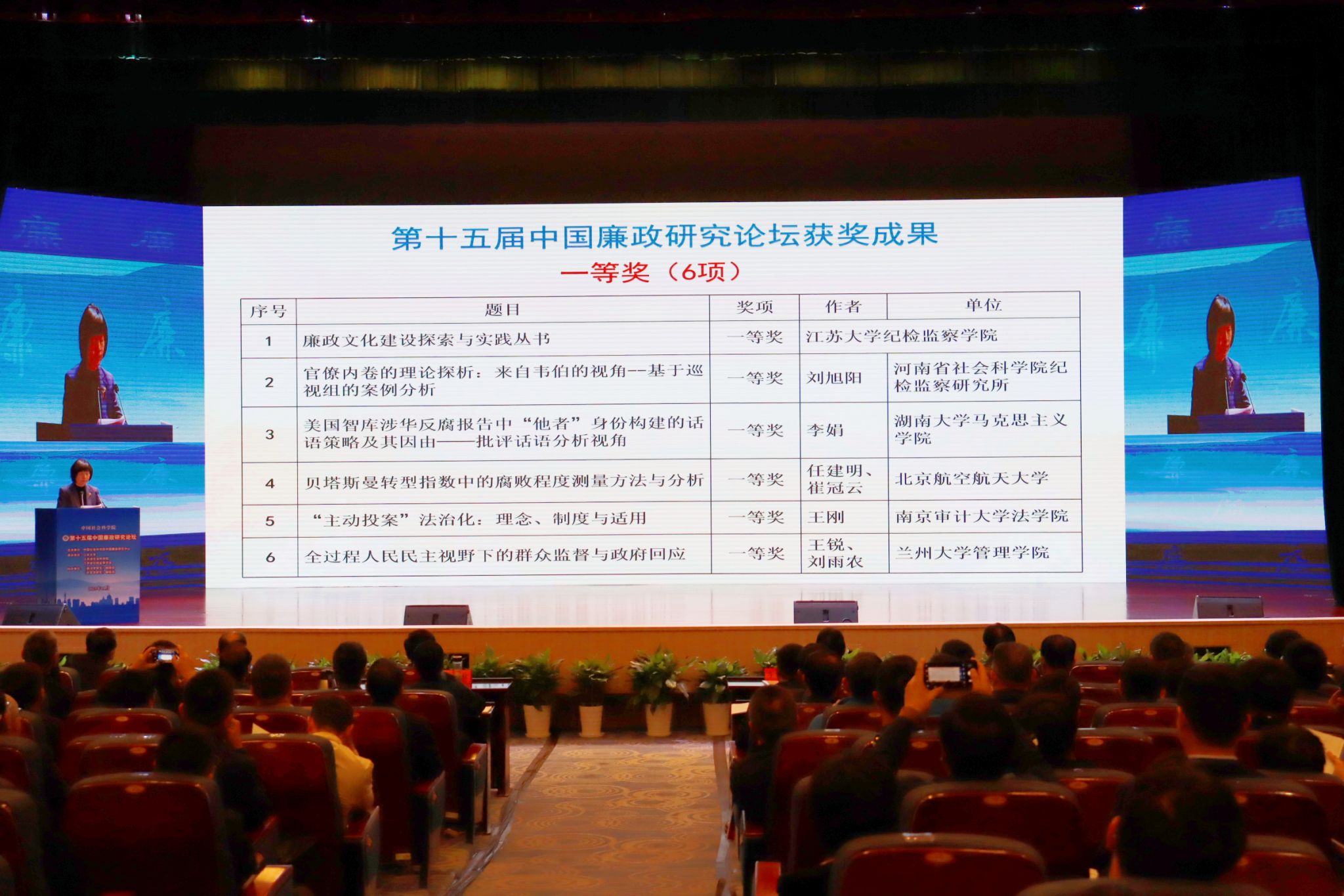 围绕“国家治理现代化与纪检监察学学科发展”主题,本次论坛共收集研究成果355项,评选出39项优秀成果。中国社会科学院直属机关党委常务副书记、中国廉政研究中心常务理事王晓霞宣布论坛获奖名单。乐鱼app官网登录入口纪检监察学院《廉政文化建设探索与实践丛书》等6项优秀成果获第十五届中国廉政研究论坛优秀成果一等奖。