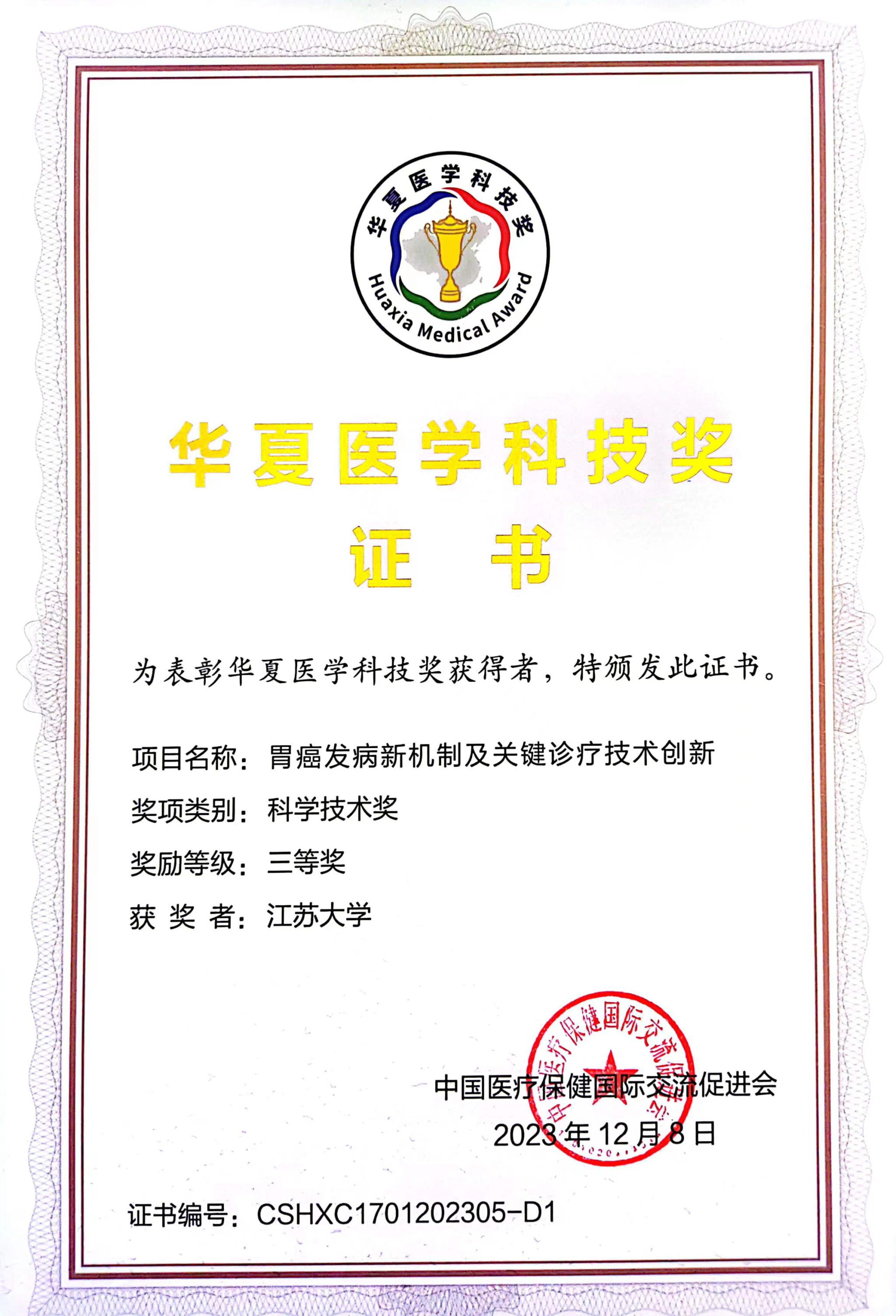 12月9日,2023年度华夏医学科技奖获奖名单正式公布。以乐鱼app官网登录入口为第一完成单位、张徐教授为第一完成人的《胃癌发病新机制及关键诊疗技术创新》项目荣获华夏医学科技奖三等奖。