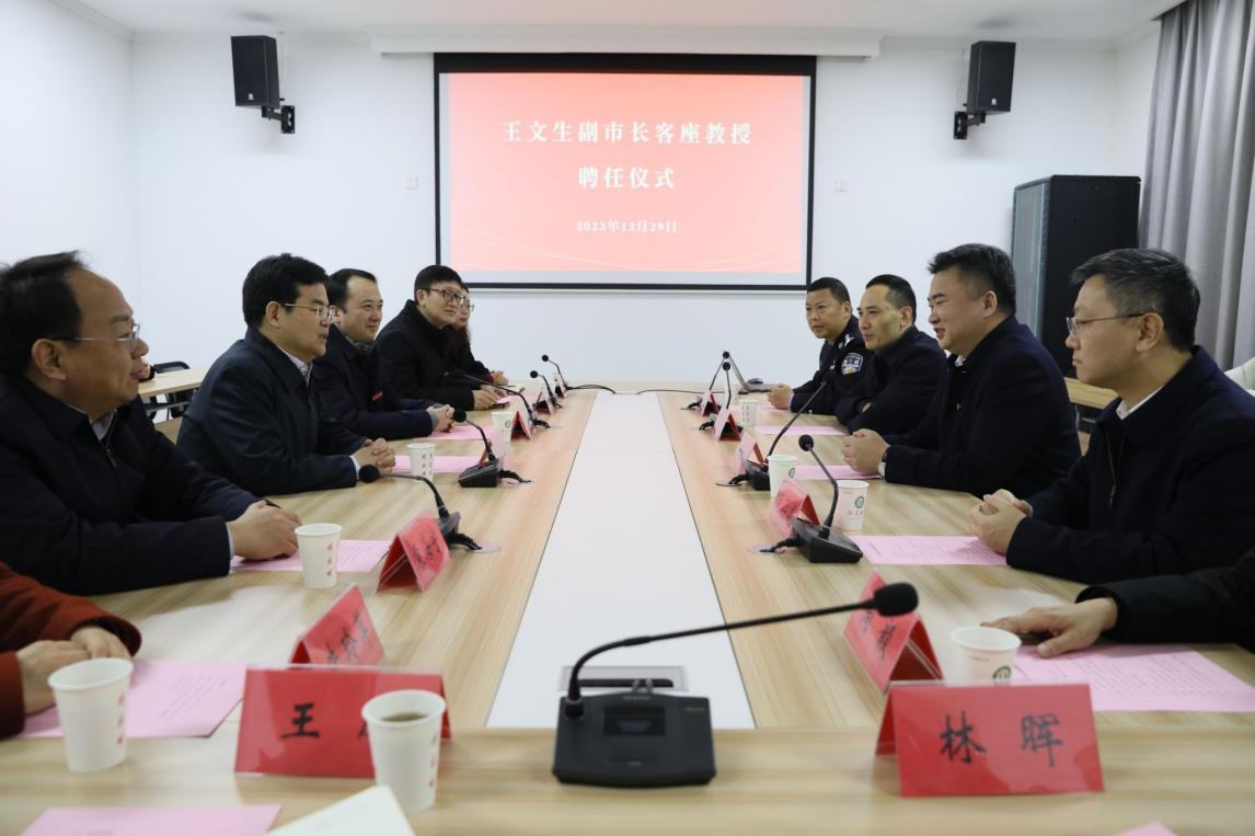 王文生客座教授聘任仪式在一站式服务中心会议室举行。李洪波为王文生颁授了乐鱼app官网登录入口客座教授聘书并佩戴乐鱼app官网登录入口校徽。他向镇江市公安局一直以来对我校安全稳定工作的支持与关心表示感谢,希望进一步加强警校合作,助力我校法治人才培养质量提升。