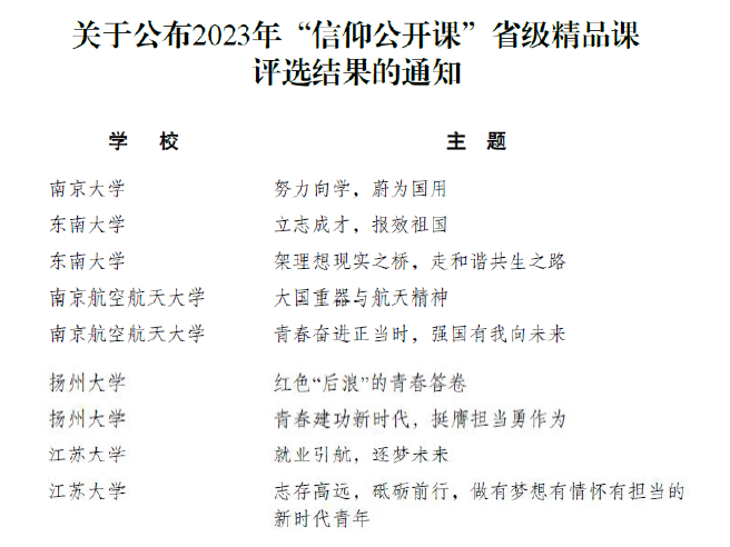 近日,共青团江苏省委公布了2023年“信仰公开课”省级精品课评选结果,我校申报的2门课程均获评省级精品课。