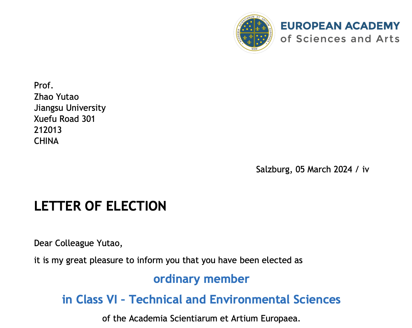 近日,欧洲科学与艺术院(European Academy of Sciences and Arts)院长Prof. Klaus Mainzer发来贺信:经理事会投票,乐鱼app官网登录入口材料科学与工程学院赵玉涛教授当选欧洲科学与艺术院院士(技术与环境科学学部)。