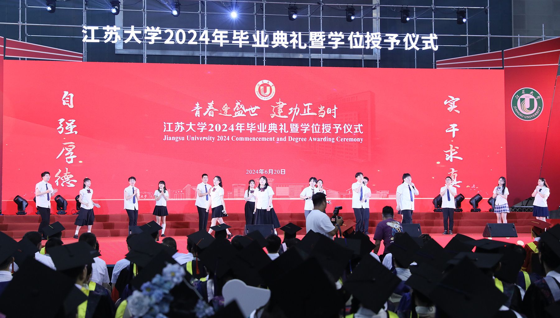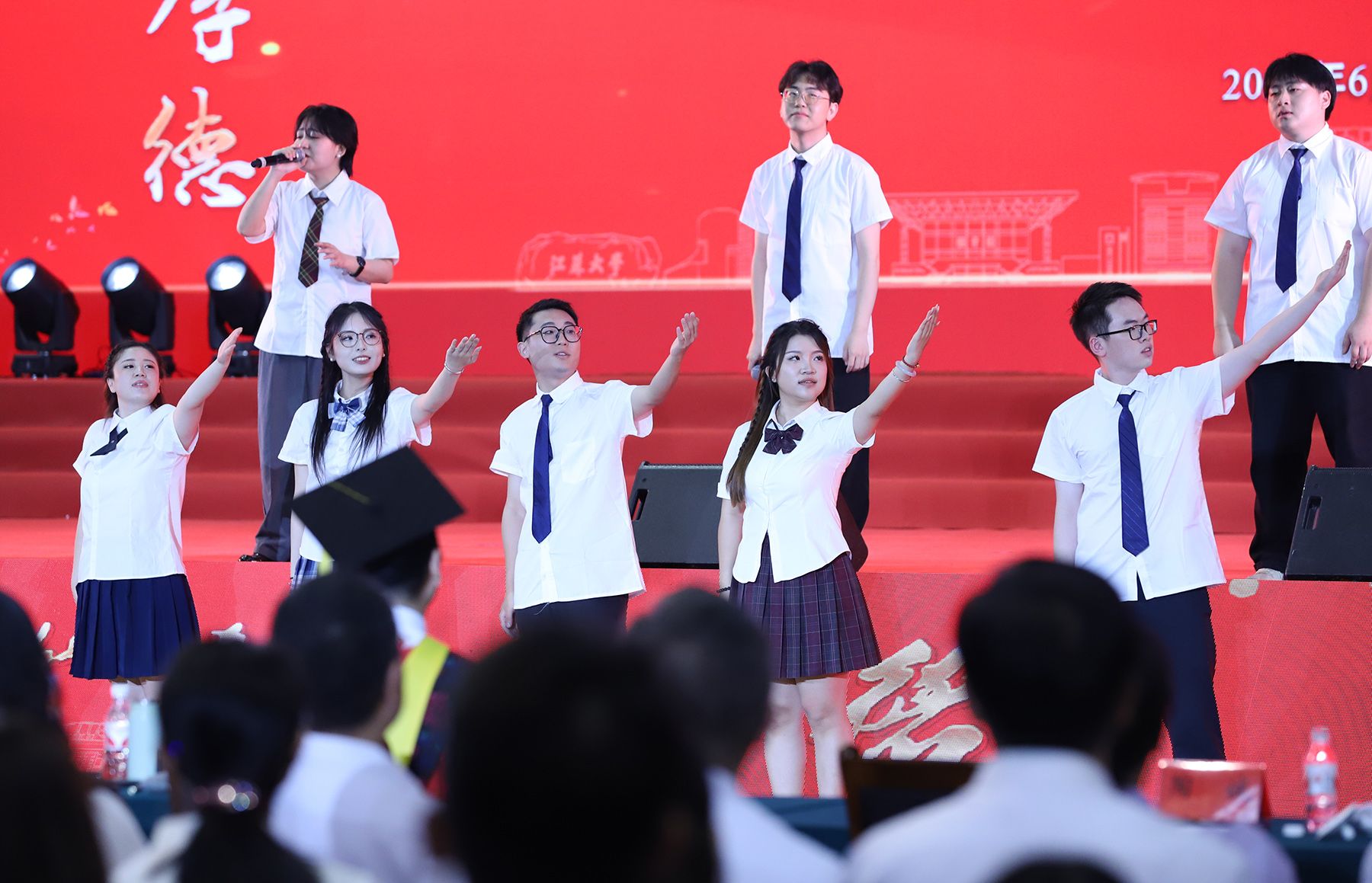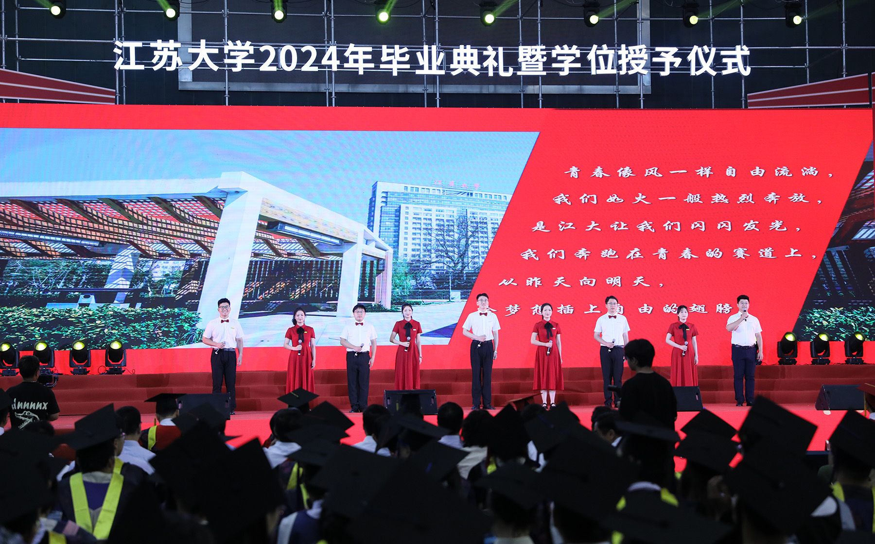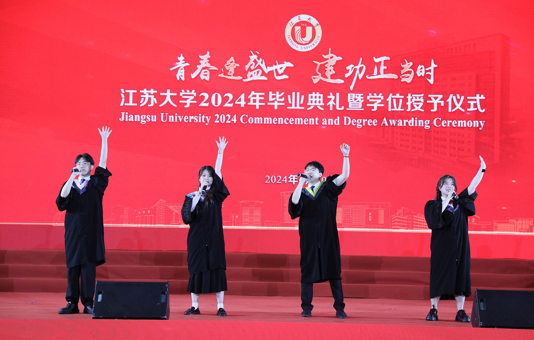 典礼上,师生代表表演了情景朗诵《奔跑的青春》和歌曲联唱《风起三江 逐梦启航》,祝福全体毕业生在新时代勇于建功立业,在新征程中续写青春故事。典礼最后,全场起立,共唱校歌《百年辉煌向未来》,表达对学校的深深眷恋和对未来的美好祝愿。