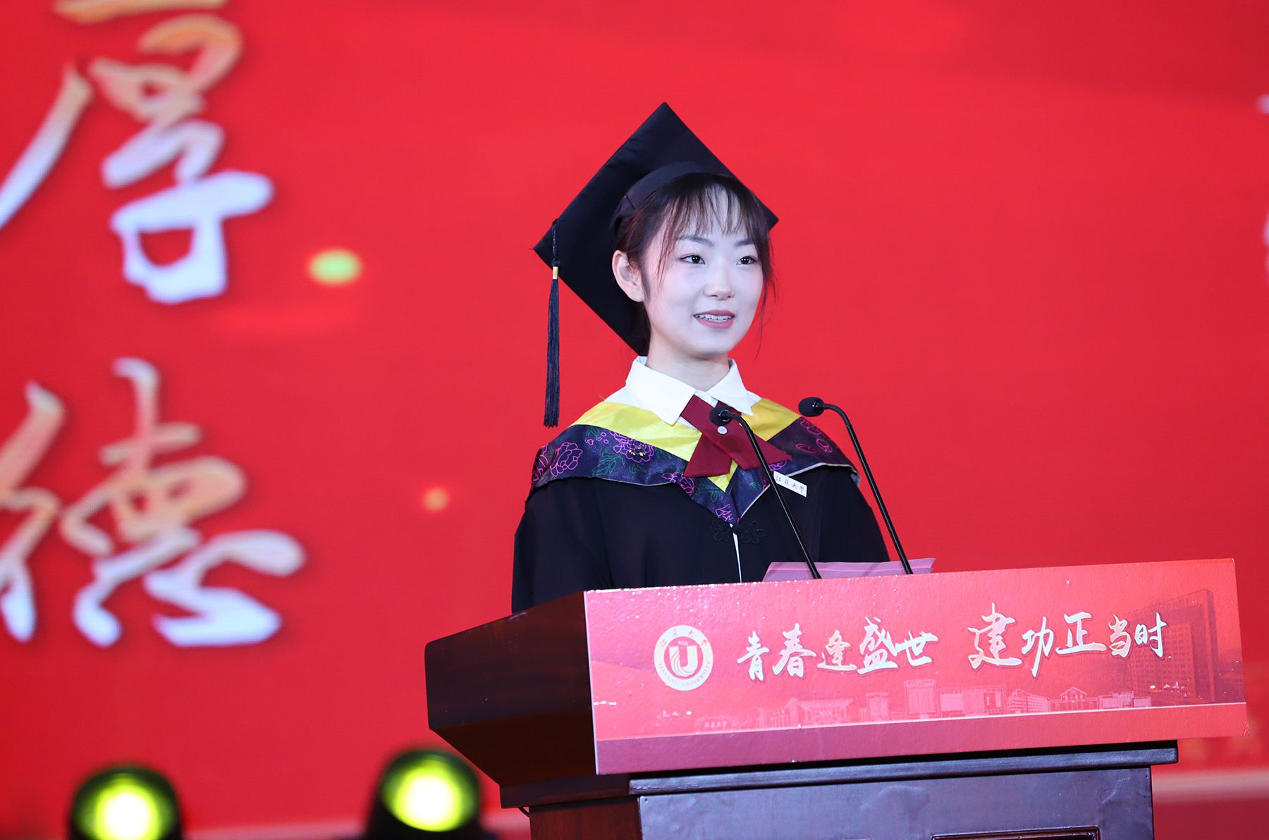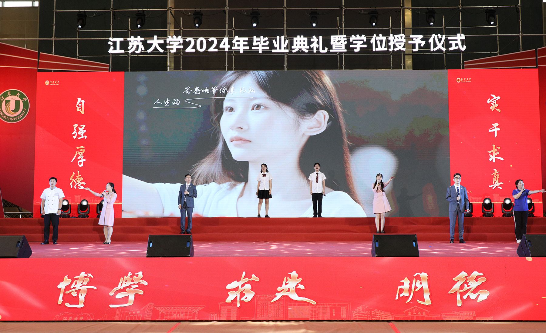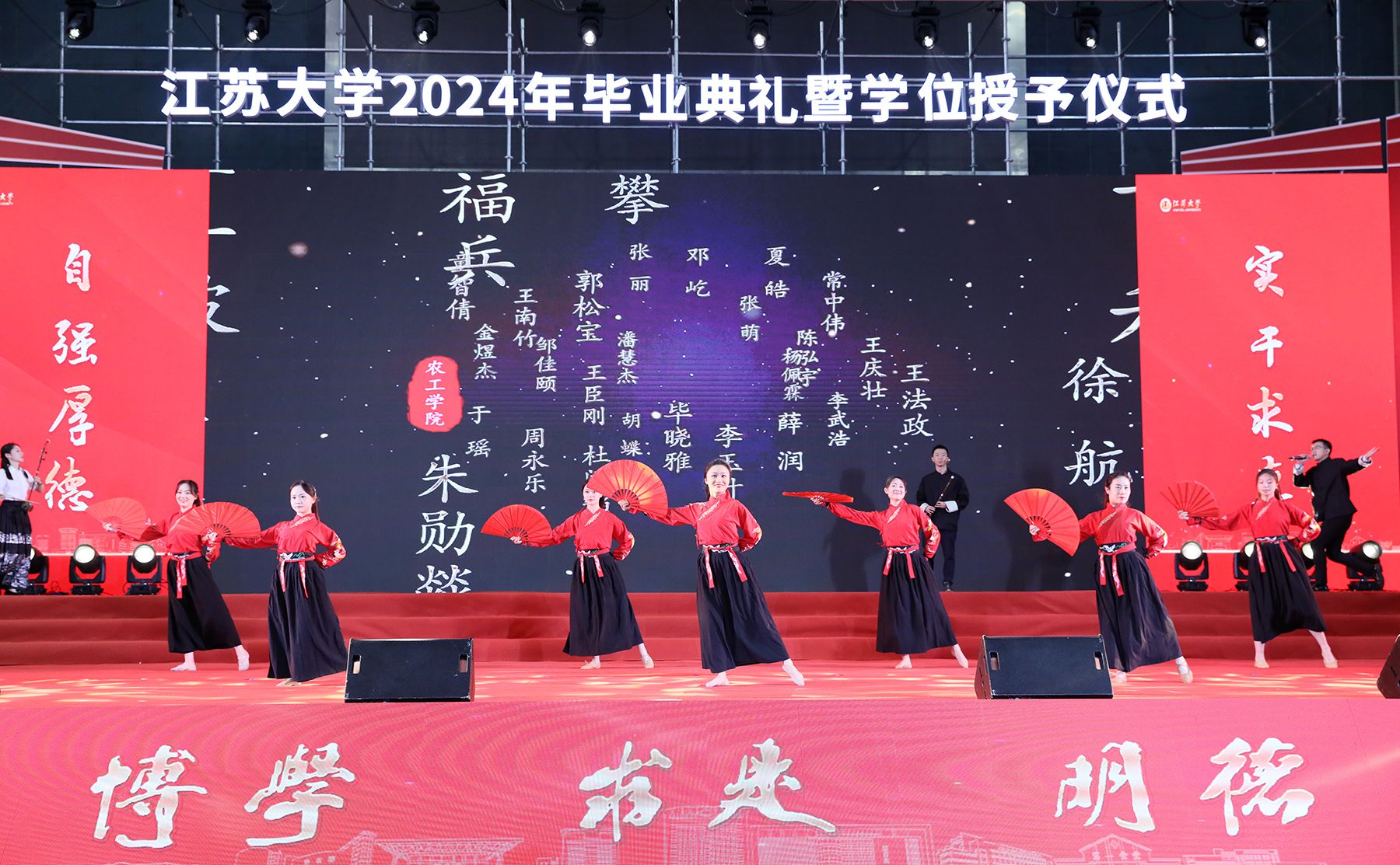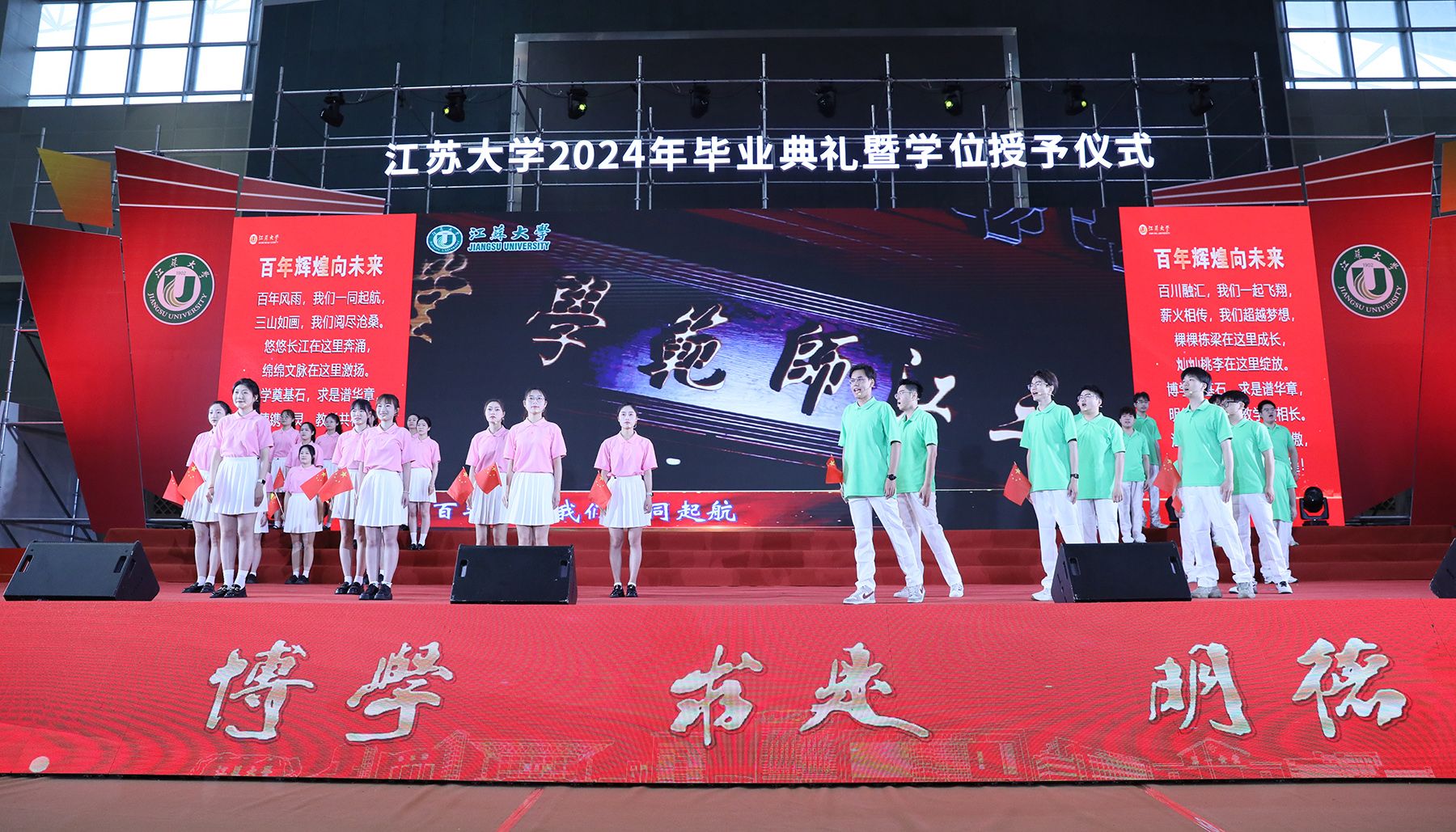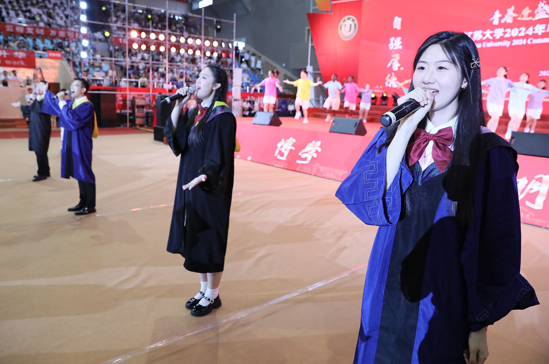 典礼上,师生代表表演了情景朗诵《奔跑的青春》和歌曲联唱《风起三江 逐梦启航》,祝福全体毕业生在新时代勇于建功立业,在新征程中续写青春故事。典礼最后,全场起立,共唱校歌《百年辉煌向未来》,表达对学校的深深眷恋和对未来的美好祝愿。