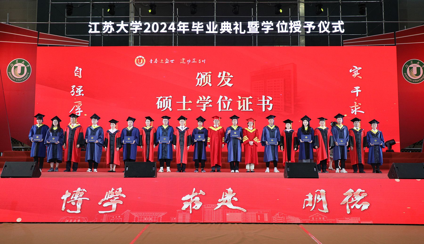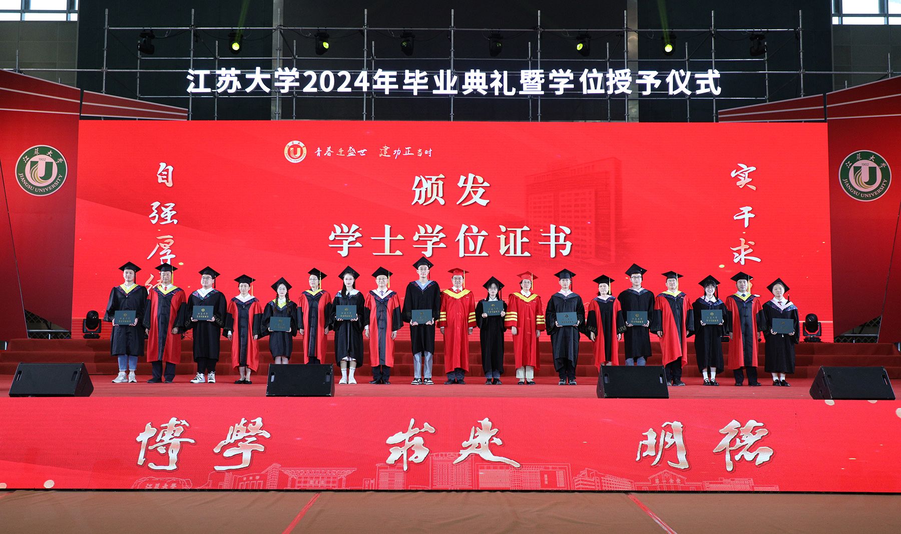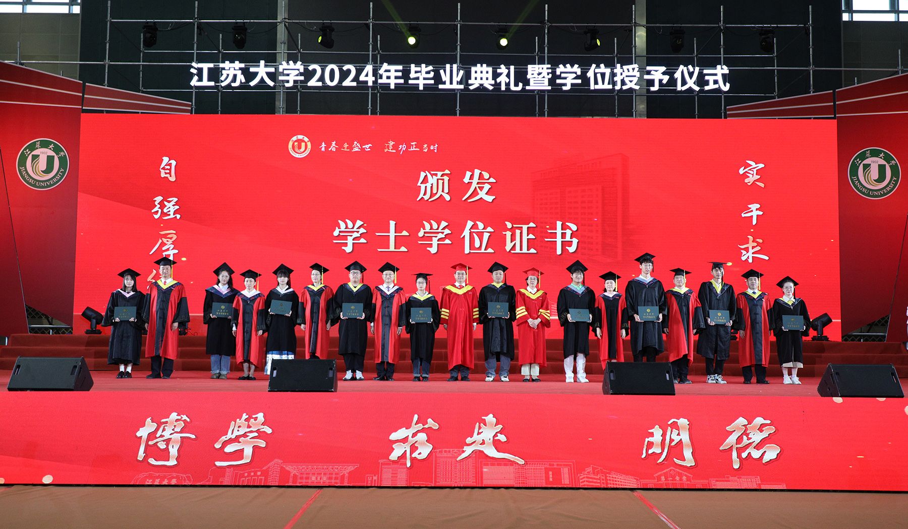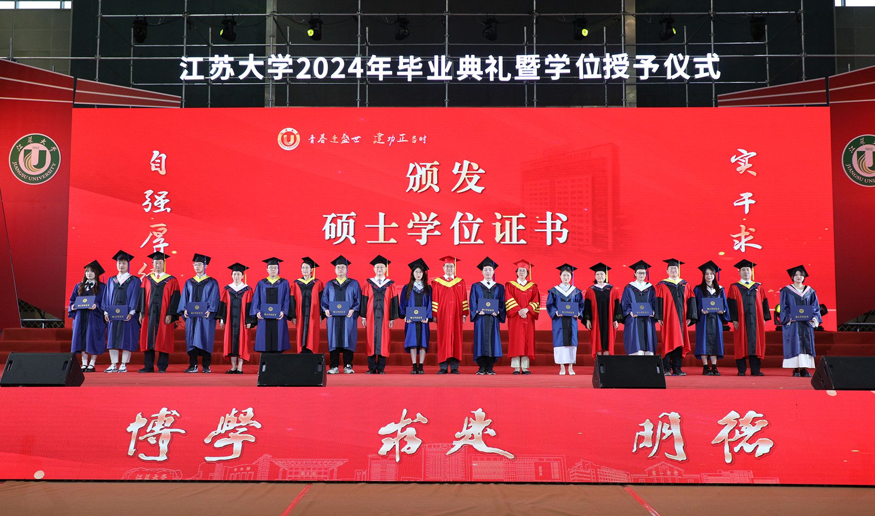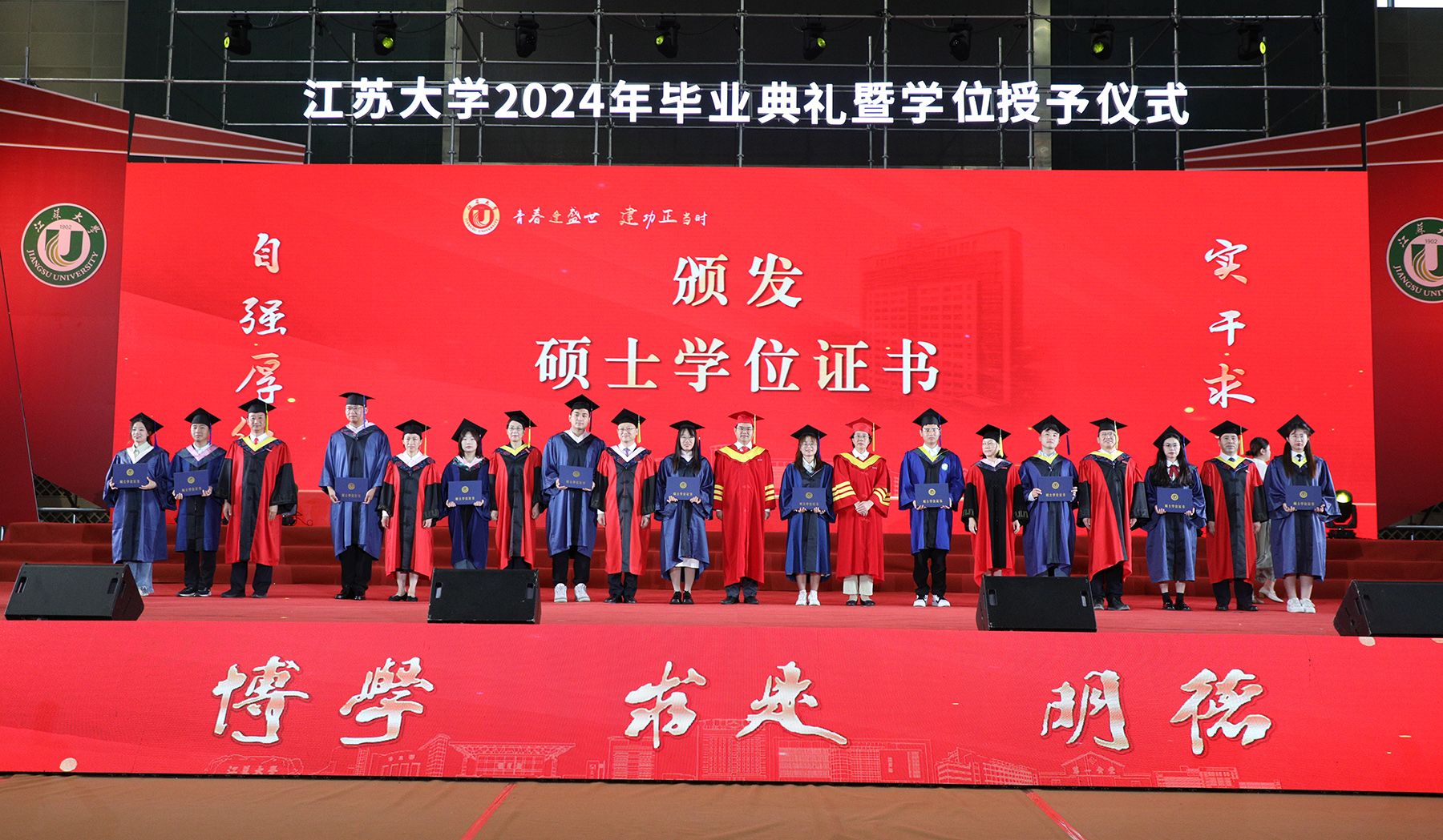 学位授予仪式上,校领导、校党委常委为博士、硕士、学士学位代表颁发学位证书并扶正流苏。