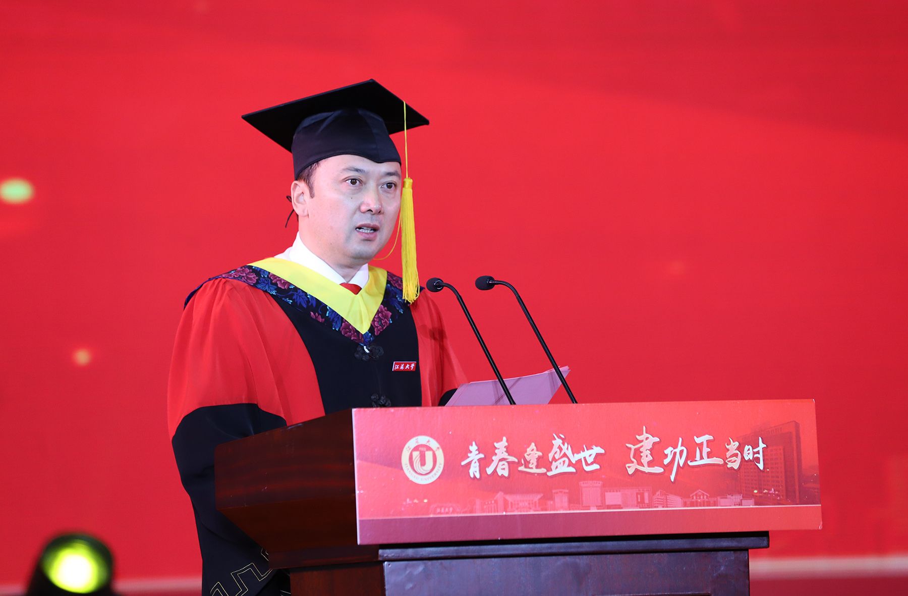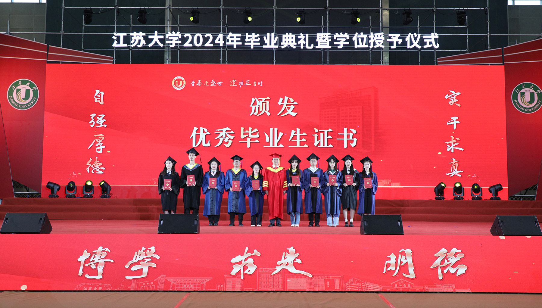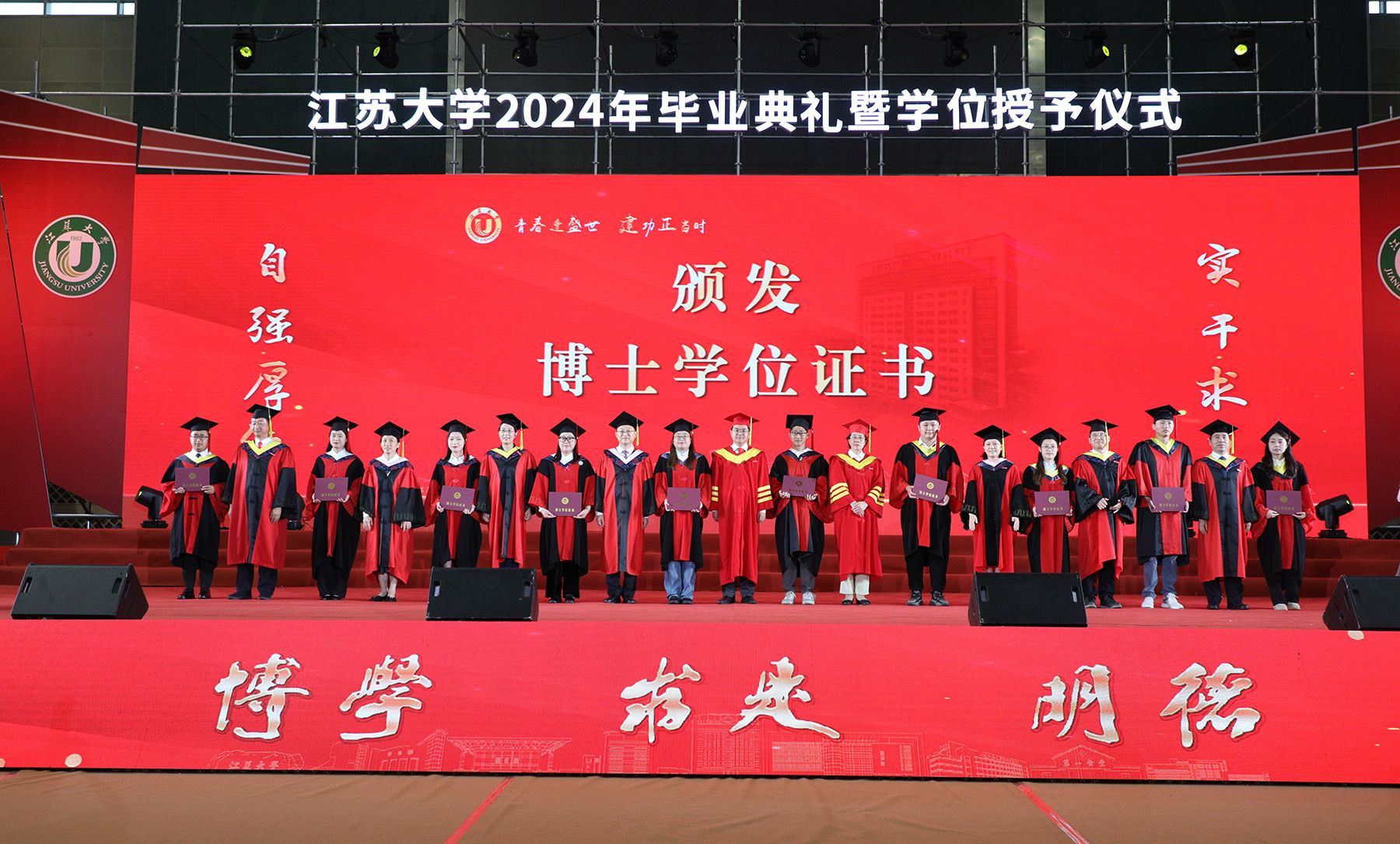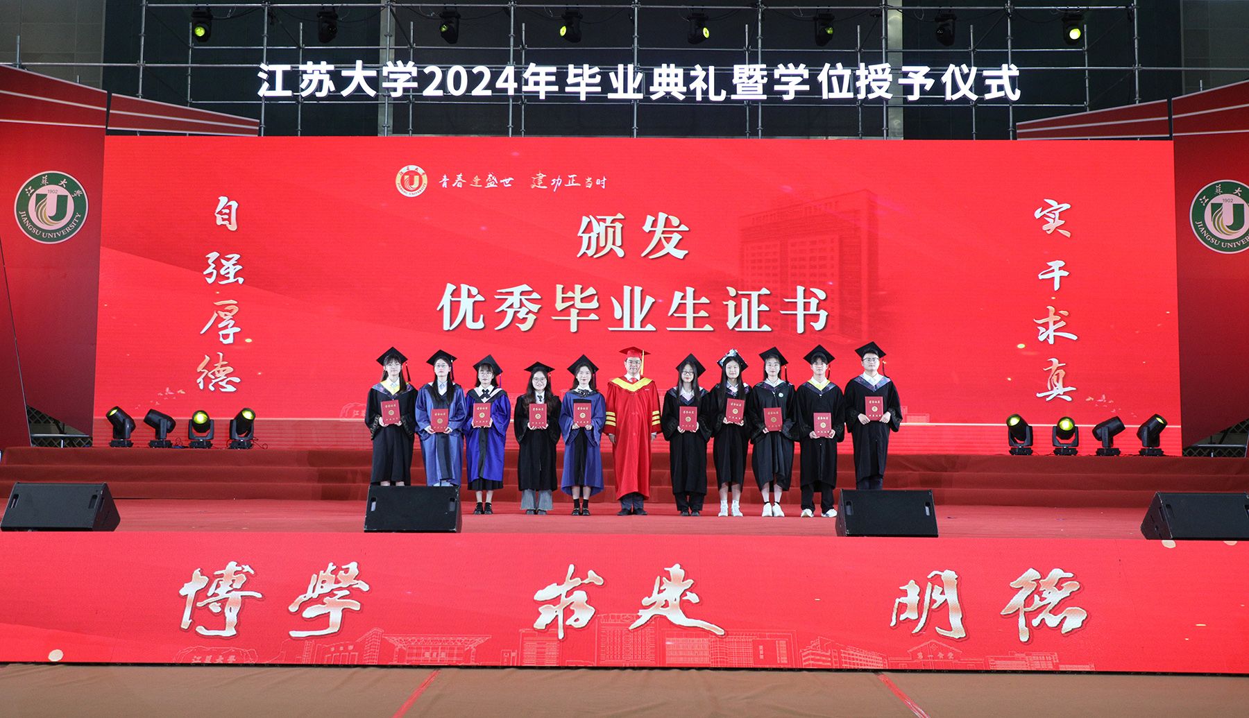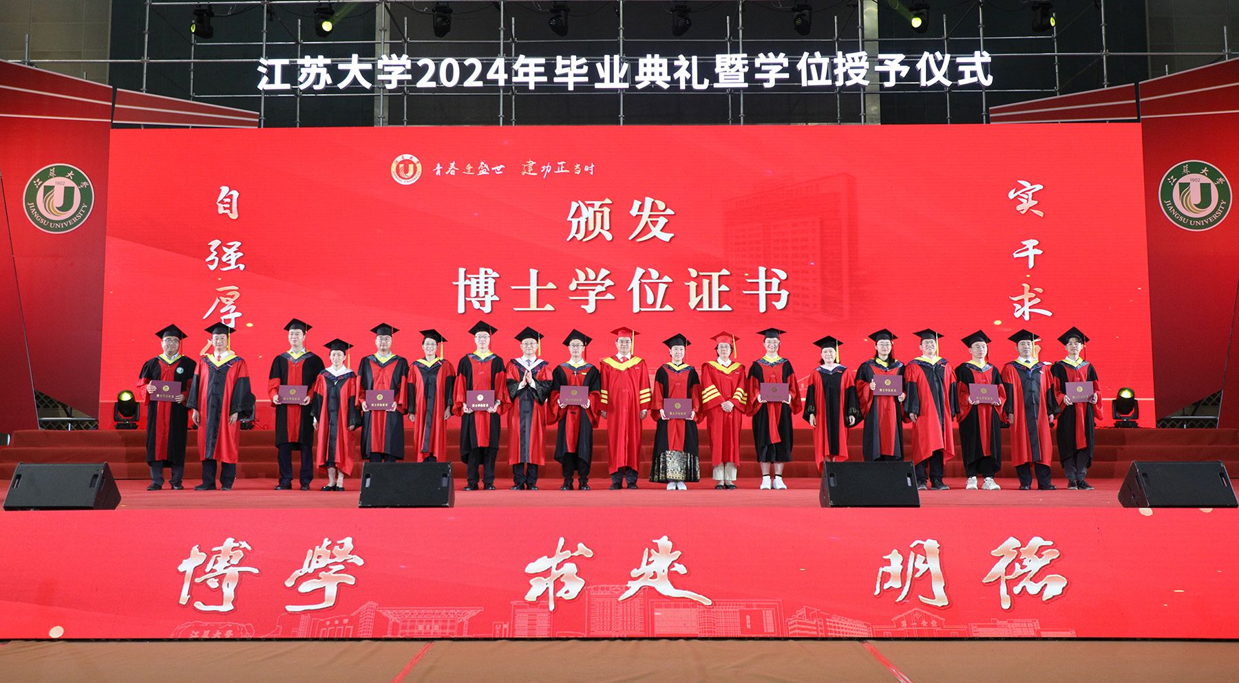 学位授予仪式上,校领导、校党委常委为博士、硕士、学士学位代表颁发学位证书并扶正流苏。