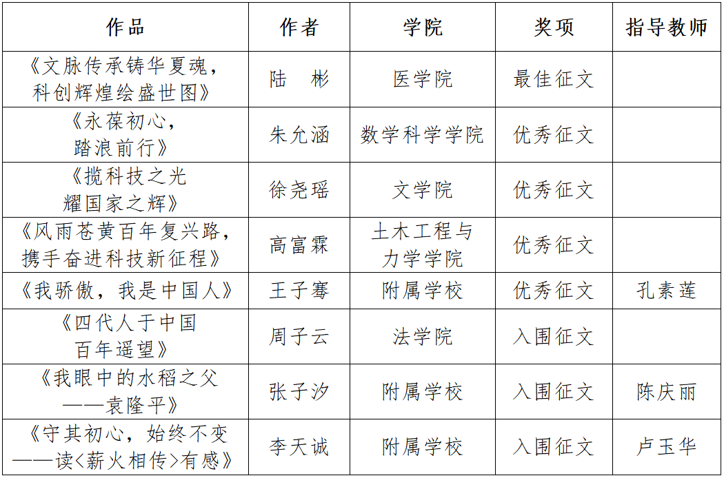 2024年,学校各二级关工委认真组织、积极开展《薪火相传——传承传统文化,建设科技强国》和《我以祖国为荣》主题教育读书征文活动,共提交征文3236篇。校关工委组织专家遴选优秀征文作品参加省教育系统关工委评选。获奖作品内容丰富,主题鲜明,充分彰显了深厚的爱国情怀和对科技强国建设的深刻理解。(关工委)
