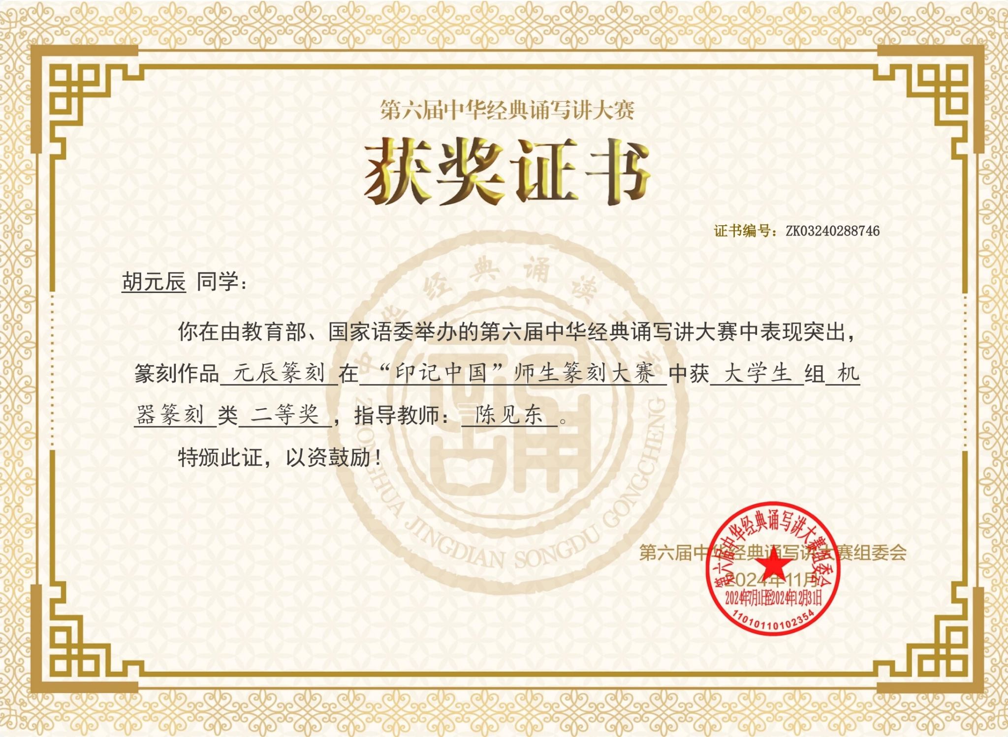 近日,第六届中华经典诵写讲大赛之“印记中国”师生篆刻大赛获奖名单正式公布。我校艺术学院胡元辰同学的篆刻作品《元辰篆刻》(指导教师:陈见东),经过逐级选拔和专家评审,荣获大学生组机器篆刻类二等奖。