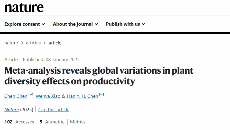 近日,国际顶级学术期刊《自然》(Nature)发表了题为Meta-analysis reveals global variations in plant diversity effects on productivity的研究论文。该论文由加拿大湖首大学(Lakehead University)、乐鱼app官网登录入口及中国科学院植物研究所等多家单位联合完成。中科院植物研究所副研究员陈晨为论文第一作者,乐鱼app官网登录入口环安学院副教授肖文娅为论文第二作者,陈晨与加拿大湖首大学教授Han Y.H. Chen为论文共同通讯作者。