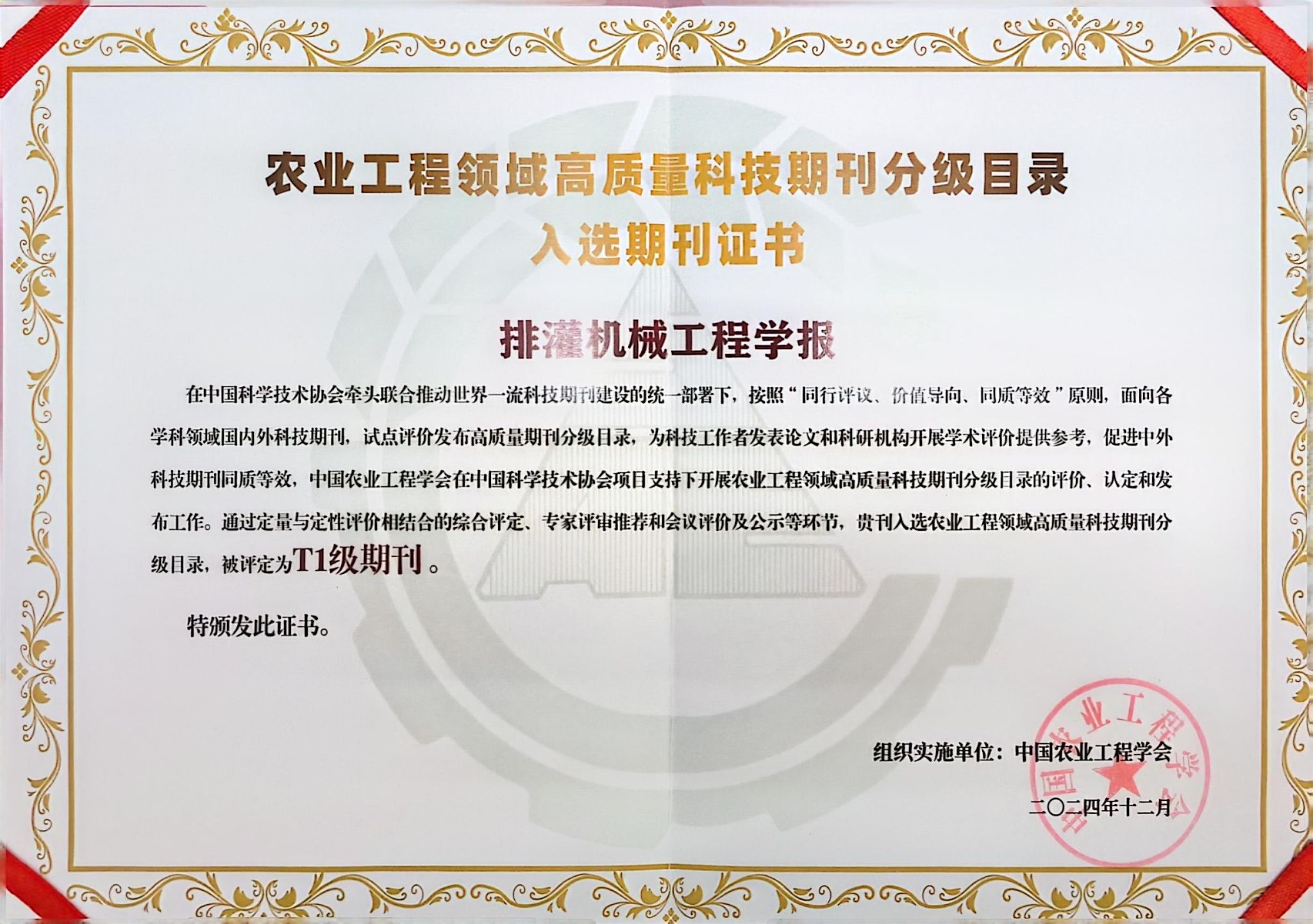 近日,中国农业工程学会在中国农业科学院国家农业图书馆召开发布会,正式发布其编制的“农业工程领域高质量科技期刊分级目录”,我校主办的《排灌机械工程学报》《乐鱼app官网登录入口学报(自然科学版)》双双入选,分别位列T1级和T2级。