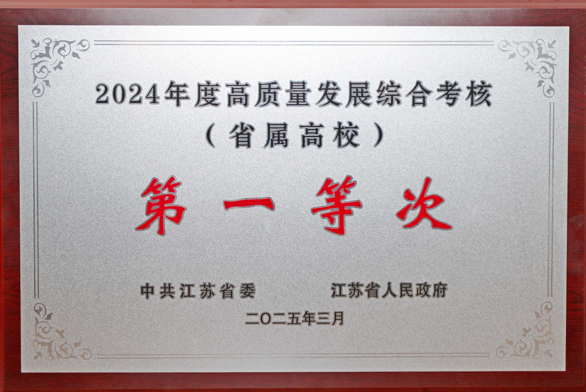 3月21日,江苏省委、省政府在南京召开全省2024年度高质量发展总结暨2025年工作推进会议。会议通报了全省2024年度高质量发展综合考核“第一等次”名单,我校榜上有名,连续5年获此殊荣。