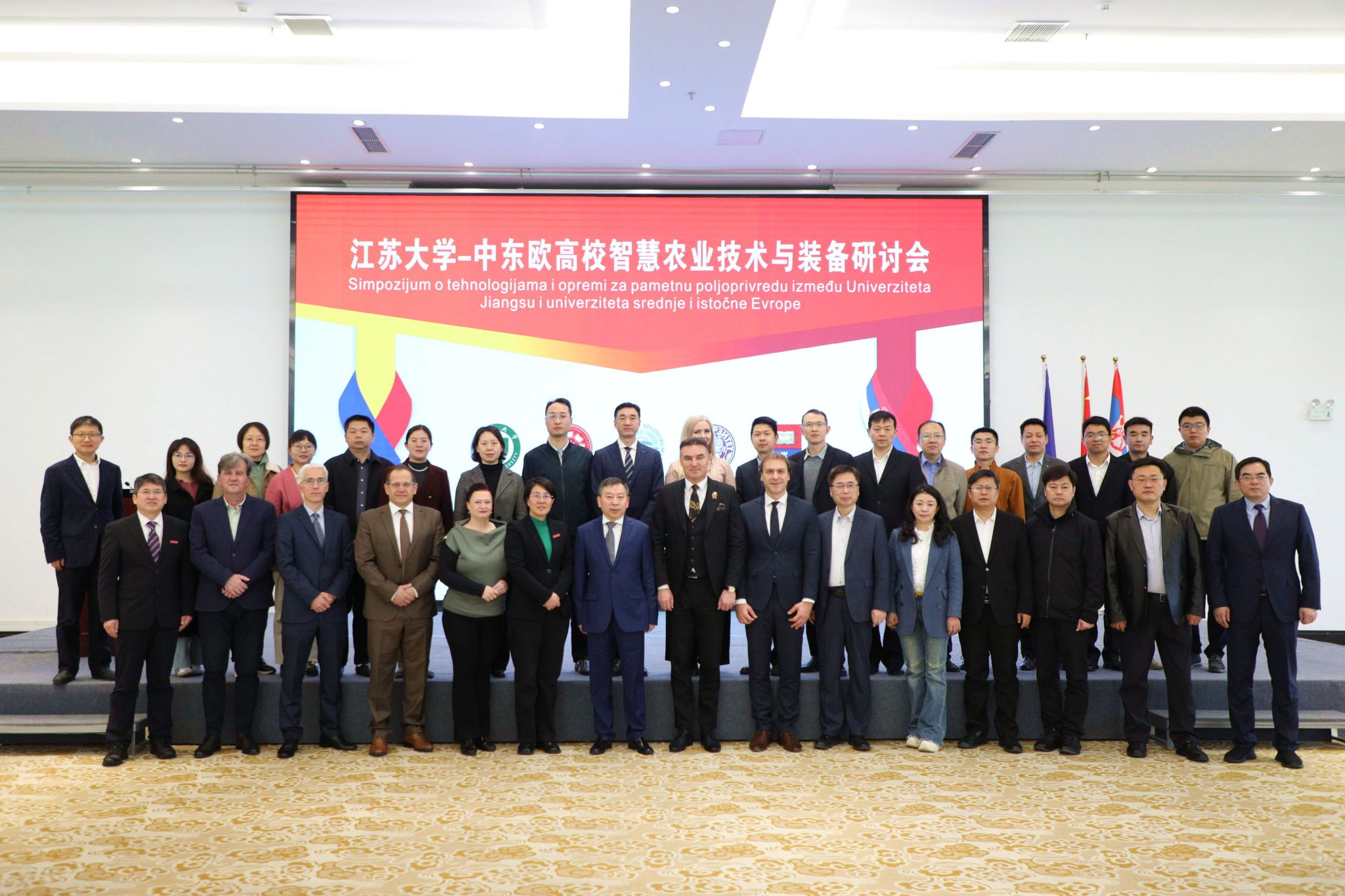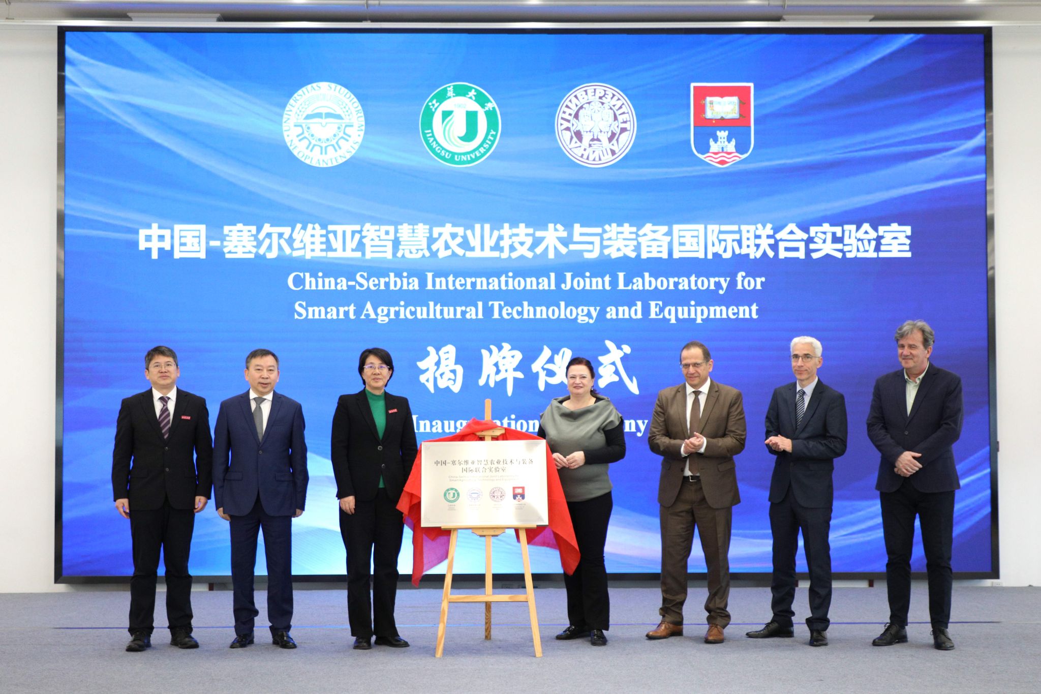 揭牌仪式环节,邢卫红、尹为民、邹小波先后与波黑高校代表、塞尔维亚高校代表共同为“中国—波黑智慧农业技术与装备国际联合实验室”和“中国—塞尔维亚智慧农业技术与装备国际联合实验室”揭牌。