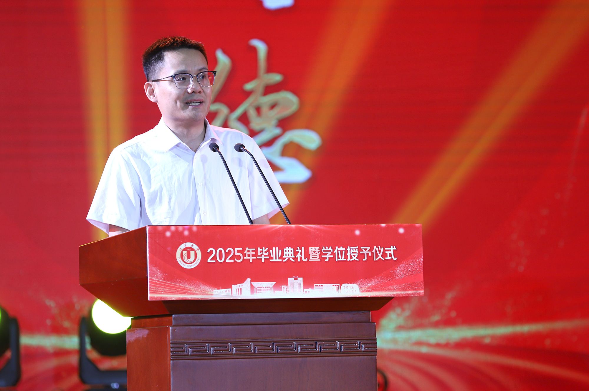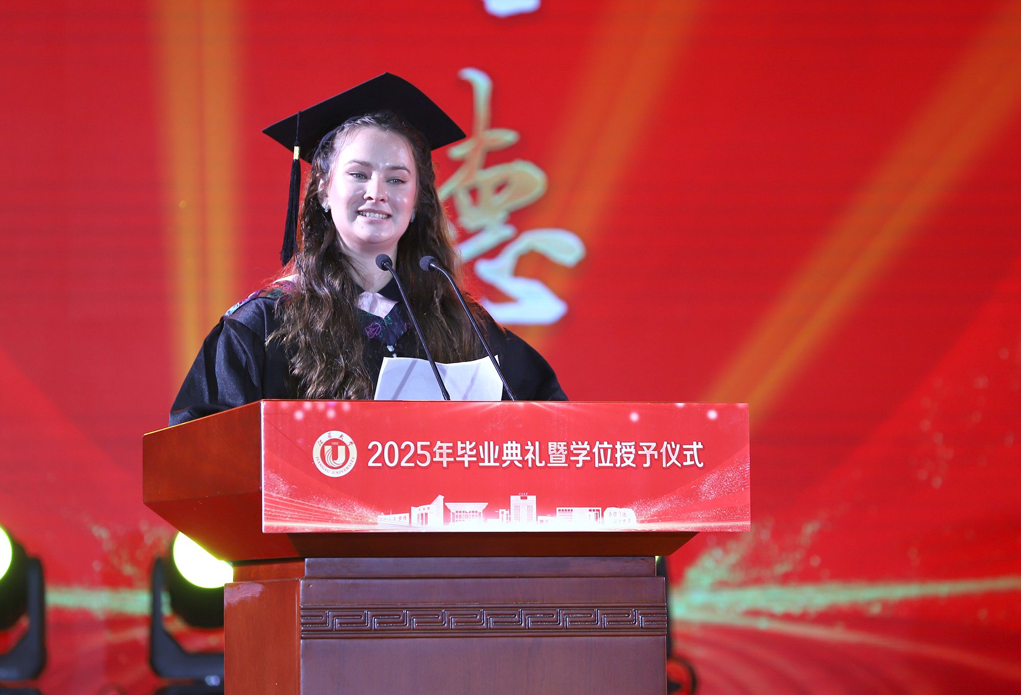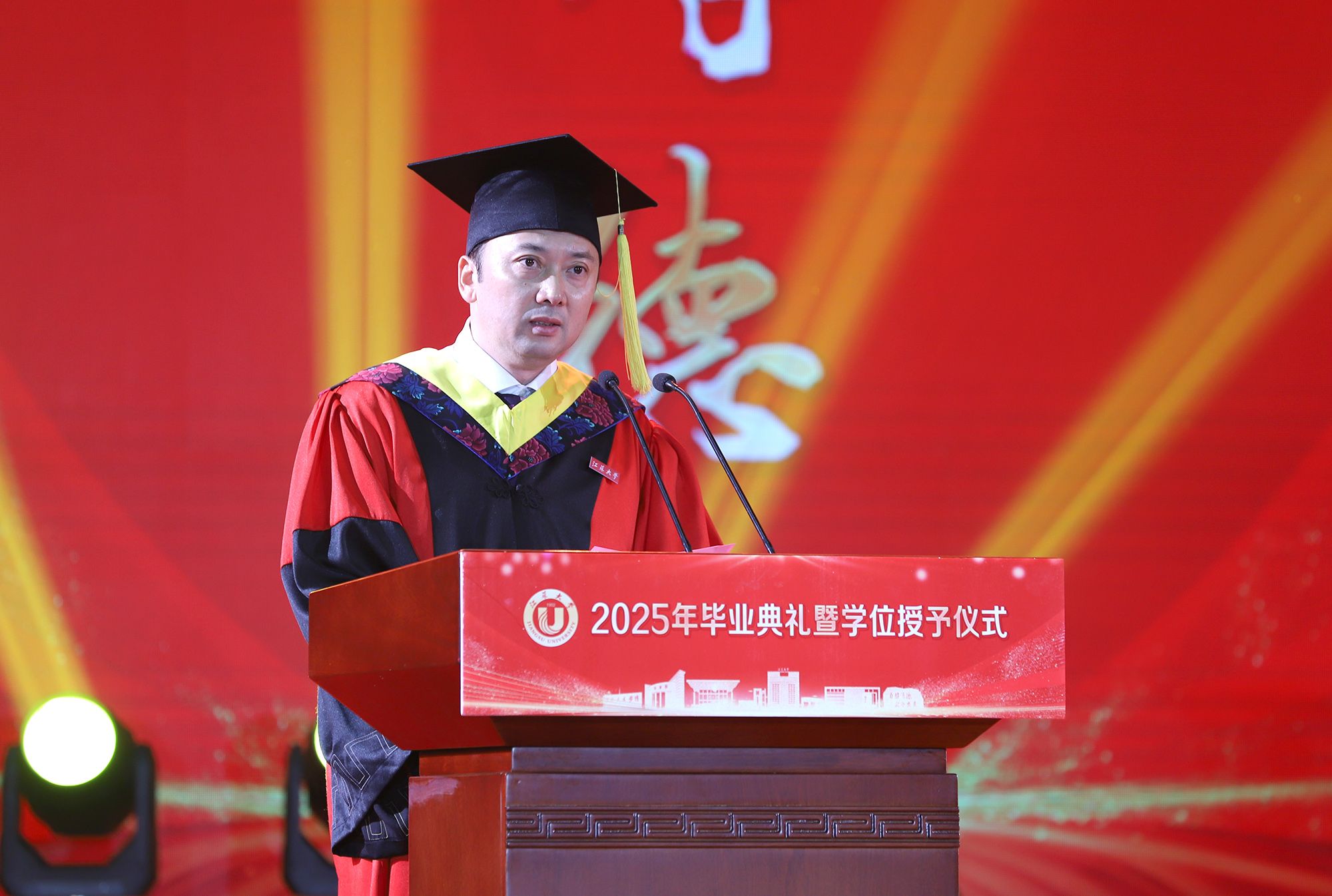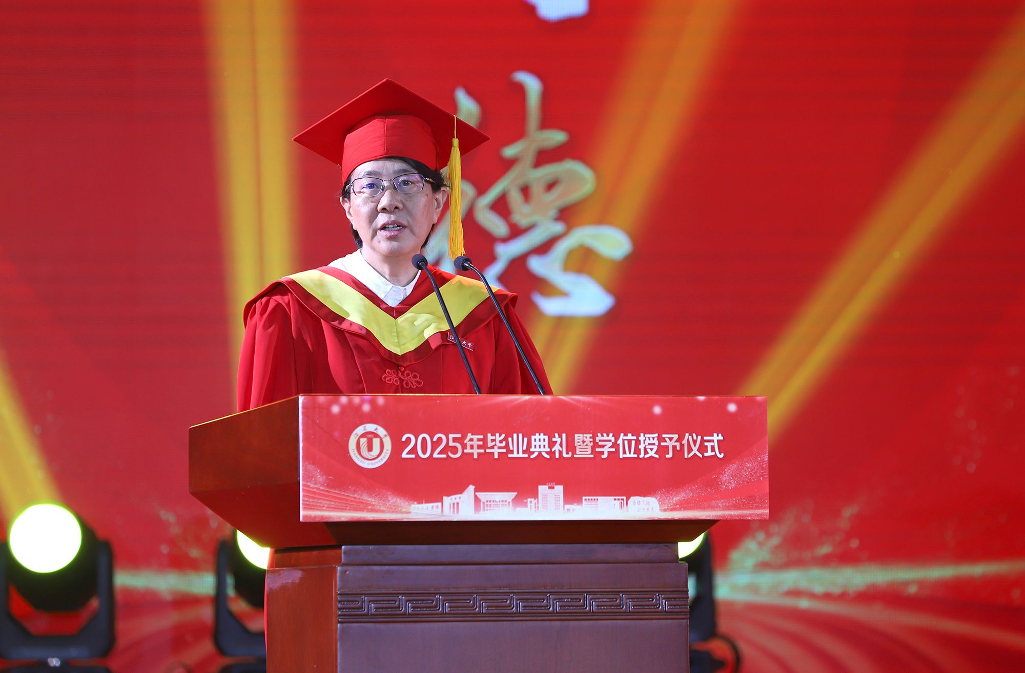 校长邢卫红发表题为《让热爱照见未来》的讲话,代表学校向全体毕业生致以热烈祝贺,向悉心关怀同学的师长、辛勤养育同学的父母以及默默支持大家成长的各界朋友,致以崇高的敬意和衷心的感谢。邢卫红说,大学更深层的意义,在于教会同学们以“热爱”为火种,照亮前路的漫长与未知。这份源自内心的热爱,已化作同学们成长路上的璀璨星光。每一位乐鱼(中国)学子奋斗的足迹、闪耀的成绩,共同汇聚成乐鱼(中国)校园最亮眼的青春图谱,照亮前行的每一步。邢卫红说,优秀没有标准答案,每一份热爱都定义着独特的精彩,每一次坚持都谱写着动人的篇章。她希望同学们因热爱而选择,在变革的时代中寻找内心的确定;因热爱而坚持,在平凡的岗位上成就非凡的业绩;因热爱而绽放,在生活的微光中积攒前行的力量。邢卫红希望同学们永远保持对生活的热忱,于细微处感受温暖美好,在热爱中拥抱天地辽阔。她祝愿大家带着乐鱼(中国)赋予的热爱与力量,勇敢奔赴山海,让热爱之光照见无比璀璨的未来。
