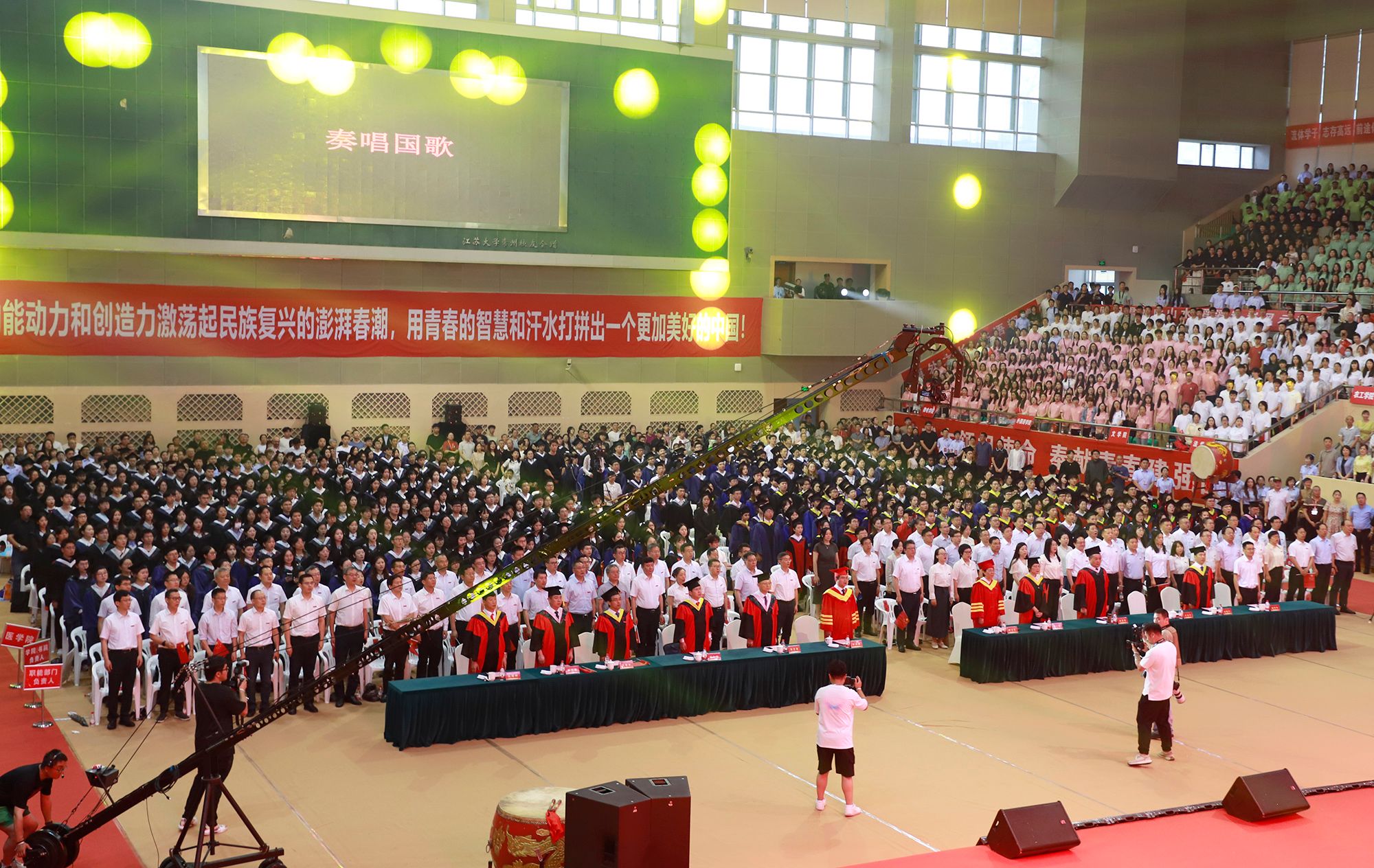 典礼上,全体起立,奏唱国歌。