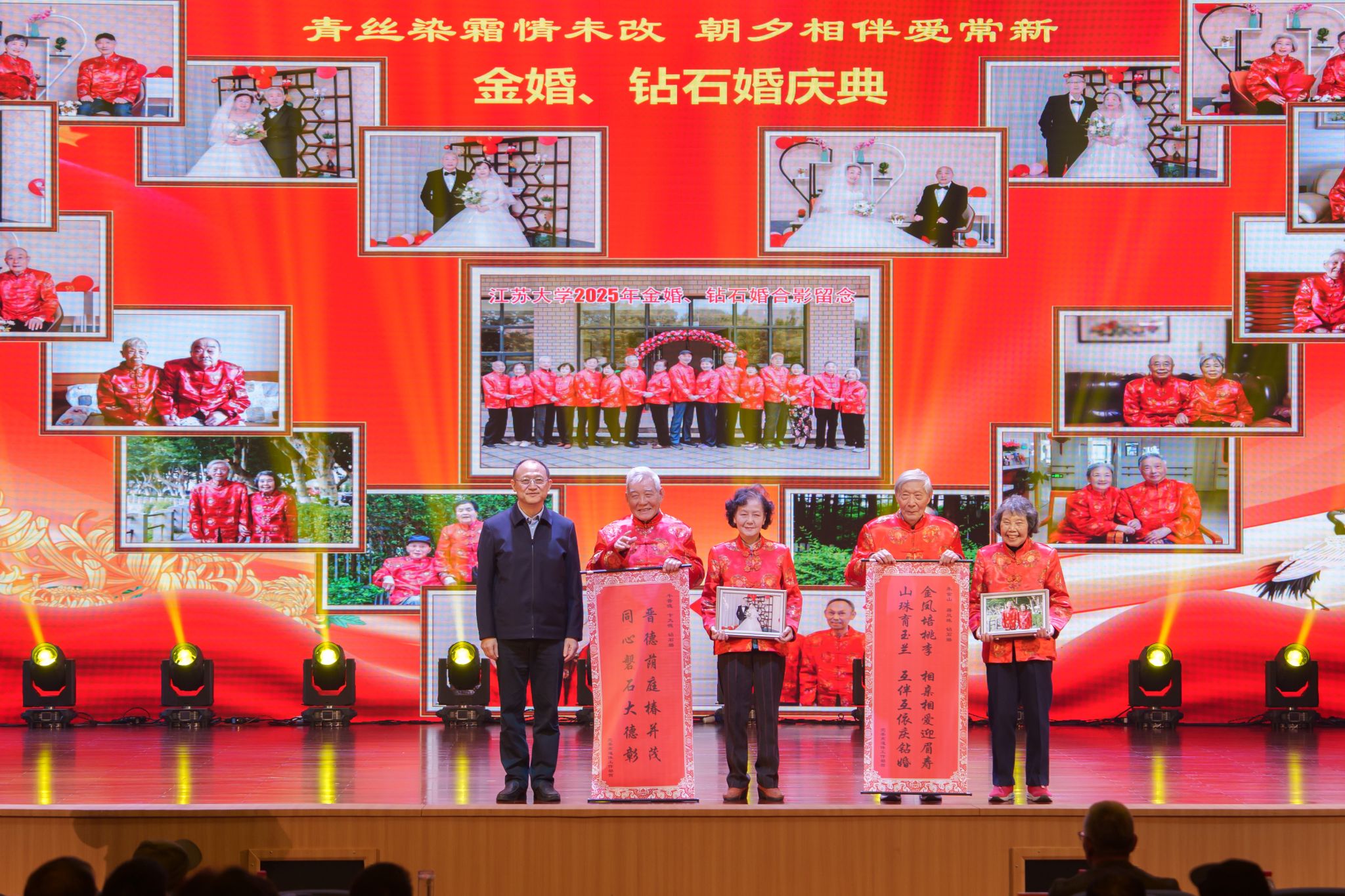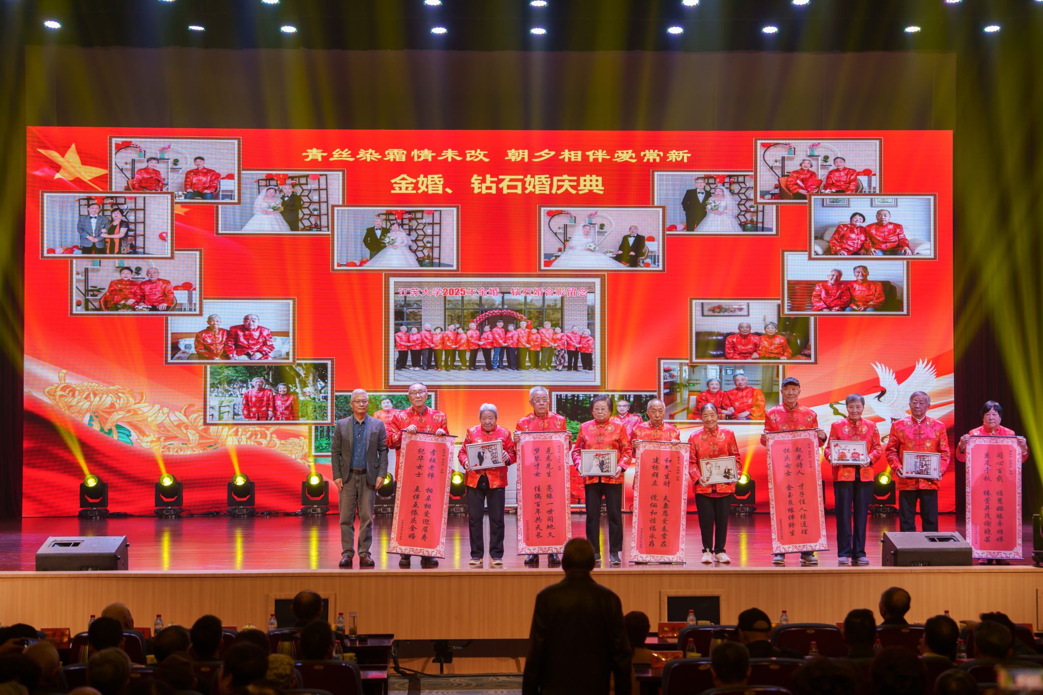 金婚、钻石婚庆典环节,陆洪标、张济建分别为金婚、钻石婚代表颁发礼品。现场掌声阵阵,温馨氛围感染全场。今年,学校共有金婚夫妇11对、钻石婚夫妇8对。离退休工作部提前为他们拍摄纪念照,绿野诗社为每对夫妇撰写了祝福楹联。