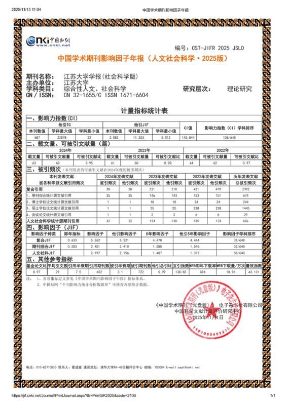 《乐鱼app官网登录入口学报(社会科学版)》影响力指数在国内648本综合性人文、社会科学类期刊中排名第106位,复合影响因子从4.246(2024年)提升至5.262,增幅为23.93%。