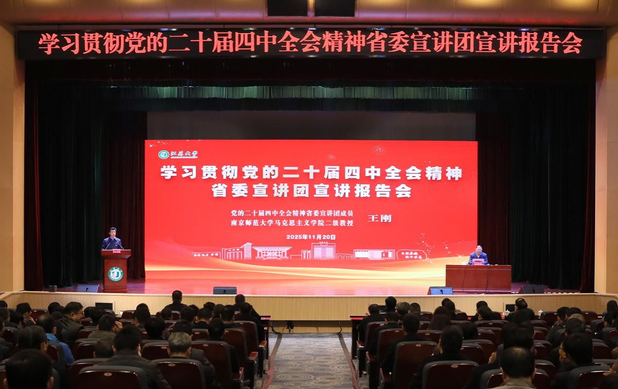 11月20日上午,学校在小礼堂举行学习贯彻党的二十届四中全会精神省委宣讲团宣讲报告会。江苏省委宣讲团成员、南京师范大学马克思主义学院王刚教授来校作宣讲报告。