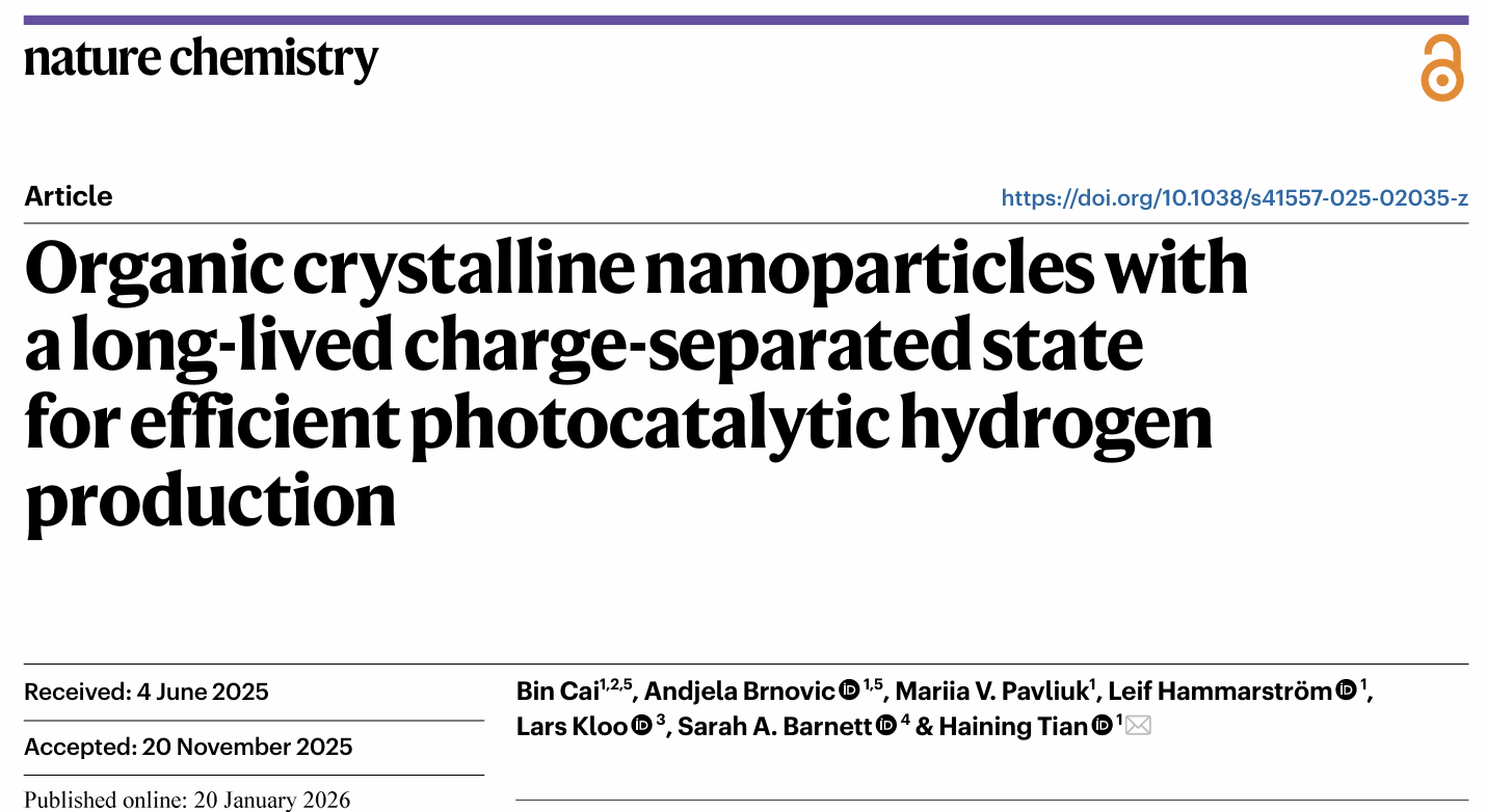 近日,我校能源研究院江苏省特聘教授蔡斌与瑞典乌普萨拉大学田海宁教授合作,以第一作者在国际顶级期刊《自然 化学》(Nature Chemistry)发表研究性论文。
