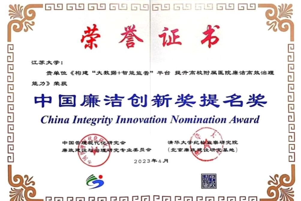 4月9日,第三届中国廉洁创新奖颁奖典礼暨中国廉洁创新高端论坛在清华大学举行。乐鱼app官网登录入口纪委组织实施、附属医院纪委牵头申报的《构建“大数据+智能监管”平台 提升高校附属医院廉洁高效治理能力》荣获中国廉洁创新奖提名奖。作为江苏省高校唯一获奖单位,校纪委委员、附属医院纪委书记吕霞应邀参加颁奖典礼。