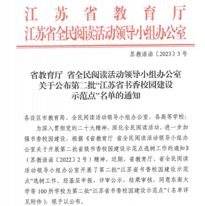 日前,江苏省教育厅公布了第二批“江苏省书香校园建设示范点”名单,乐鱼app官网登录入口成功入选。