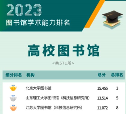 6月19日,图书馆学术评价课题组联合新文科专委会正式发布“2023图书馆学术能力排名”。本次共统计图书情报类机构782所,上榜机构为234所(前30%),乐鱼app官网登录入口图书馆表现优异,位列高校系统第三名。