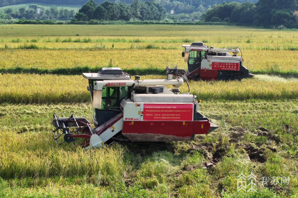 戴庄村白沙自然村,田里的稻谷长势喜人,颜色金黄,颗粒饱满。两台低碾压率再生稻联合收获机正在田间来回“奔跑”,收割、脱粒、装车,一派繁忙的丰收景象。随着收获机的持续推进,该片区近350亩连片稻田将在3天左右收割完毕。