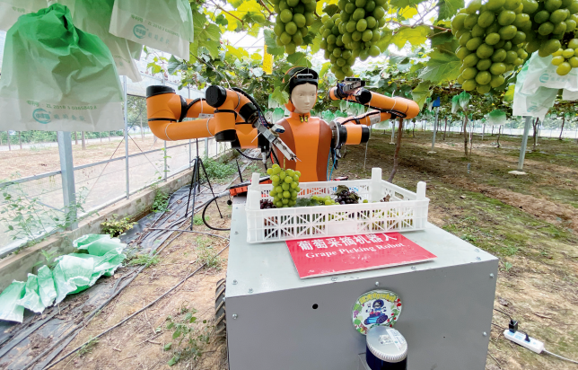 2023年9月,乐鱼app官网登录入口研发的系列多臂高速采摘机器人系统正在演示(乐鱼app官网登录入口供图)