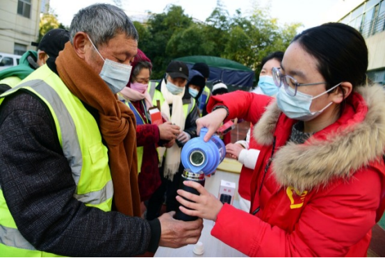 1月16日,乐鱼app官网登录入口志愿者向环卫工人赠送围巾和保温杯。石玉成 摄