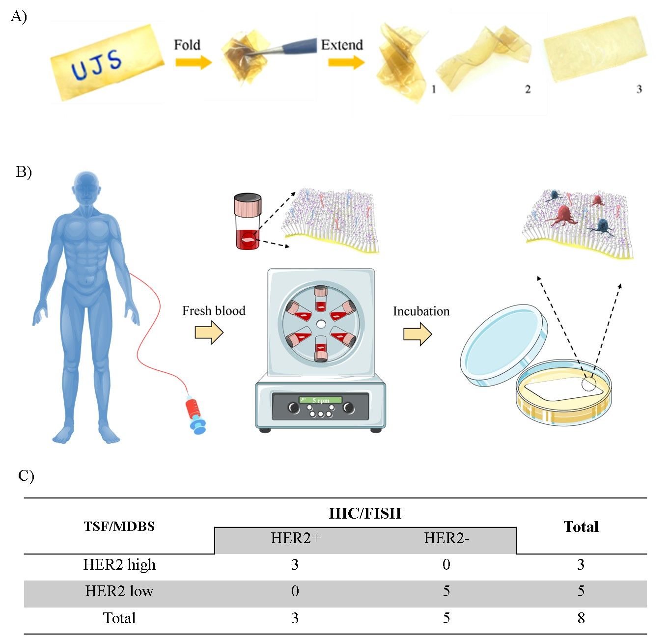 图2. A) TSF/MDBS实物图。B). 癌症病人血液样本中CTCs捕获的机理图示。C) 癌症病人血液样本中捕获的CTCs分类。