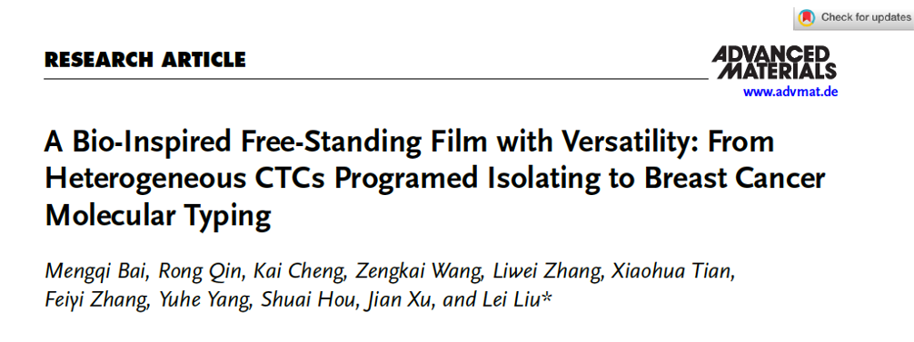 近日,乐鱼app官网登录入口材料学院博士研究生白蒙起(导师刘磊研究员)以第一作者在国际材料学权威期刊Advanced Materials上在线发表题为“A Bio-Inspired Free-Standing Film with Versatility: From Heterogeneous CTCs Programed Isolating to Breast Cancer Molecular Typing”的研究论文,乐鱼app官网登录入口为该论文的第一单位和唯一通讯单位。