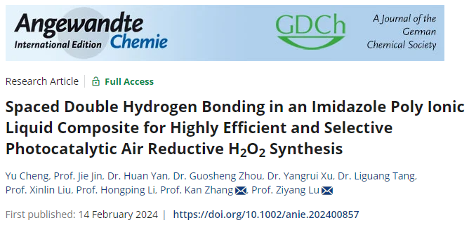 近日,我校最新研究论文“Spaced Double Hydrogen Bonding in an Imidazole Poly Ionic Liquid Composite for Highly Efficient and Selective Photocatalytic Air Reductive H2O2 Synthesis”在《德国应用化学》(Angewandte Chemie-International Edition )(IF:16.6)上在线发表。乐鱼app官网登录入口为第一完成单位,环境与安全工程学院硕士研究生程煜、教师金杰为共同第一作者,教师逯子扬为通讯作者。