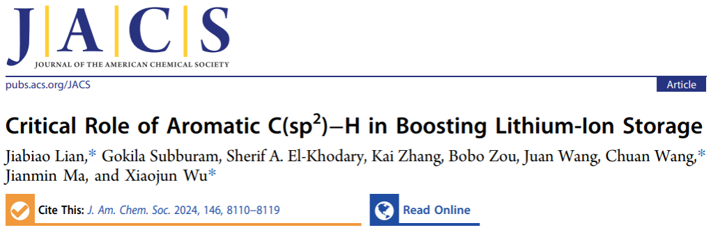 近日,我校能源研究院连加彪研究员团队在化学与材料领域顶级期刊《美国化学会志》(Journal of the American Chemical Society)上发表研究论文“Critical Role of Aromatic C(sp2)−H in Boosting Lithium-Ion Storage”。乐鱼app官网登录入口为第一完成单位,材料科学与工程学院/能源研究院博士研究生高克拉为学生第一作者,连加彪、南京工业大学王川教授和中国科学技术大学武晓君教授为共同通讯作者。