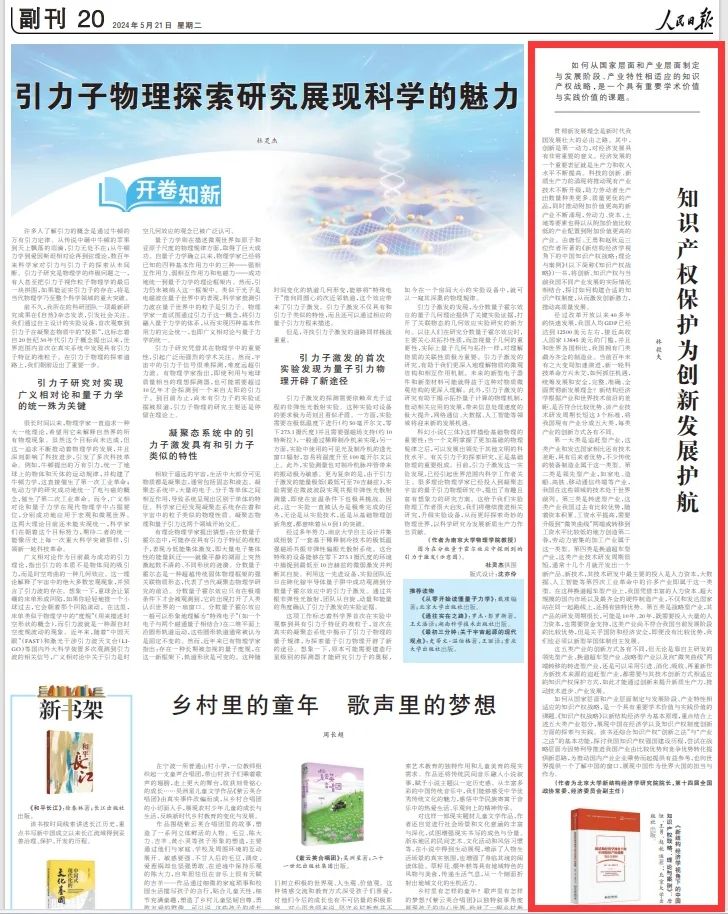 5月21日,北京大学新结构经济学研究院院长,第十四届全国政协常委、经济委员会副主任林毅夫教授在人民日报撰文《知识产权保护为创新发展护航》,向社会各界推荐由乐鱼app官网登录入口知识产权学院直属党支部书记、新结构经济学知识产权研究院执行院长唐恒教授,以及北京大学新结构经济学研究院学术副院长王勇、赵秋运博士合著的《新结构经济学视角下的中国知识产权战略:理论与案例》一书。