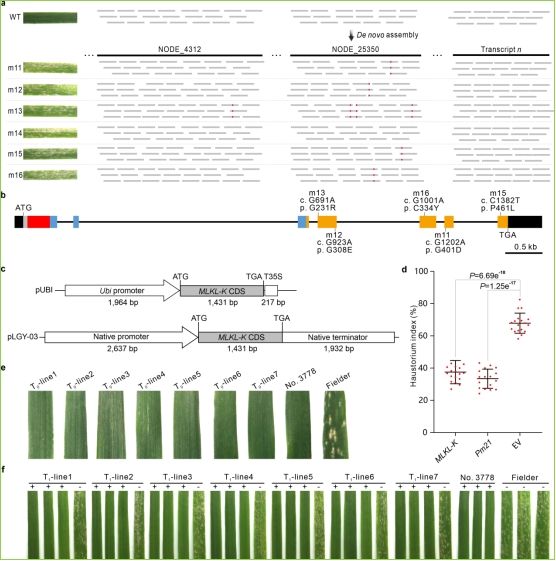 该研究利用60Co-γ射线对携带Pm13的易位系No.3778进行辐照,创制了10个感白粉病的染色体缺失系,借助分子标记将Pm13定位到0.74 Mb的物理区间。接着对野生型材料和EMS诱导的感病突变体进行转录组测序分析,将一个新型融合激酶蛋白基因MLKL-K鉴定为候选基因,随后进行基因枪介导的瞬时表达分析和农杆菌介导的转基因分析,证实MLKL-K就是目的基因Pm13,对小麦提供了高效的白粉病抗性。