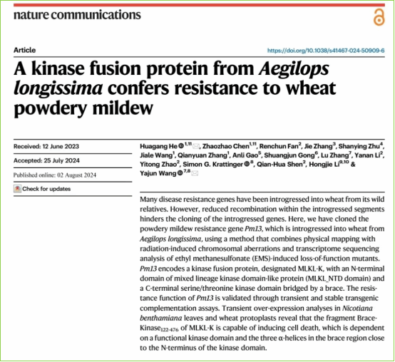 近日,生命科学学院何华纲团队联合多家单位在《自然·通讯》(Nature Communications)上发表题为“A kinase fusion protein from Aegilops longissima confers resistance to wheat powdery mildew”的研究论文,报道了来源于高大山羊草的小麦抗白粉病基因Pm13的克隆,并揭示了其生化功能和进化特性。乐鱼app官网登录入口生命科学学院为第一完成单位,何华纲为第一作者兼通讯作者,合作单位中国科学院分子植物科学卓越创新中心王亚军研究员为共同通讯作者,硕士研究生陈昭昭为共同第一作者,硕士研究生王甲乐、张倩渊参加了部分工作。