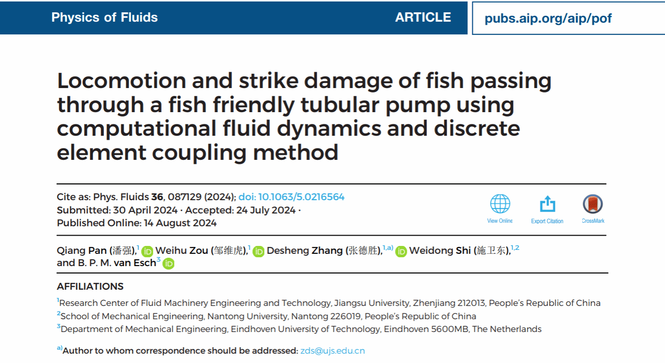 近日,我校流体机械工程技术研究中心张德胜教授团队与荷兰埃因霍温理工大学巴特·范·埃施教授团队合作,在流体领域Top期刊《流体物理》(Physics of Fluids)发表了题为“Locomotion and strike damage of fish passing through a fish friendly tubular pump using computational fluid dynamics and discrete element coupling method”的研究论文。青年教师潘强副教授为论文第一作者,张德胜为通讯作者。