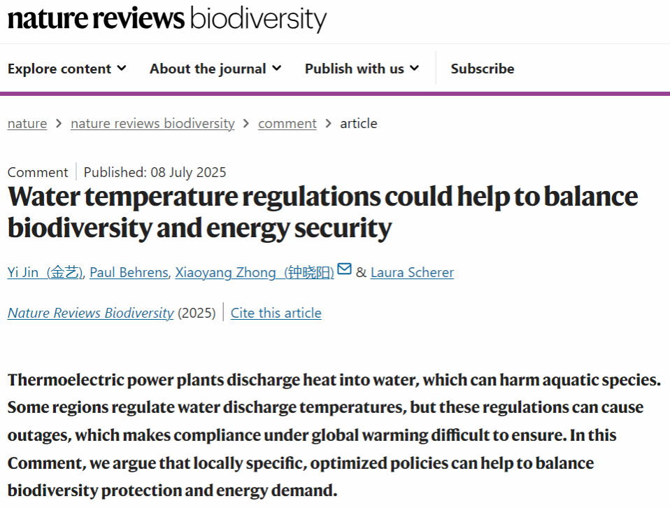 7月8日,产业经济研究院教师金艺在Nature子刊《自然综述:生物多样性》(Nature Reviews Biodiversity)以Water temperature regulations could help to balance biodiversity and energy security为题发表论文。金艺为论文第一作者,乐鱼app官网登录入口为第一完成单位,国际应用系统分析研究所(IIASA)钟晓阳为论文通讯作者,英国牛津大学教授Paul Behrens和荷兰莱顿大学副教授Laura Scherer为论文合作者。